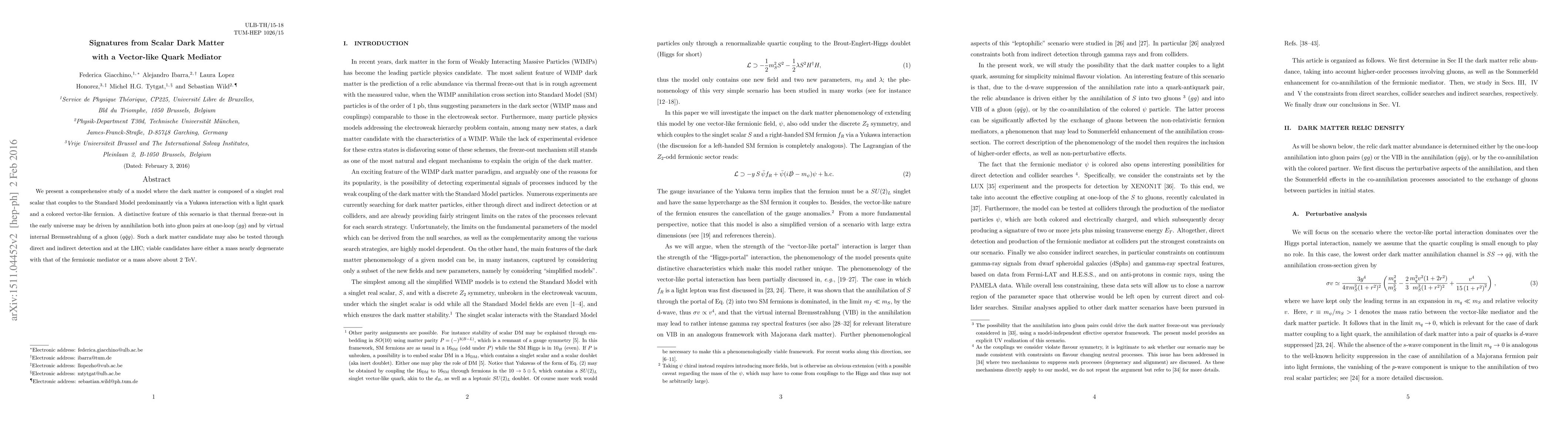 We present a comprehensive study of a model where the dark matter is composed of a singlet real scalar that couples to the Standard Model predominantly via a Yukawa interaction with a light quark and a colored vector-like fermion. A distinctive feature of this scenario is that thermal freeze-out in the early universe may be driven by annihilation both into gluon pairs at one-loop ($gg$) and by virtual internal Bremsstrahlung of a gluon ($q \bar{q} g$). Such a dark matter candidate may also be tested through direct and indirect detection and at the LHC; viable candidates have either a mass nearly degenerate with that of the fermionic mediator or a mass above about 2 TeV.
