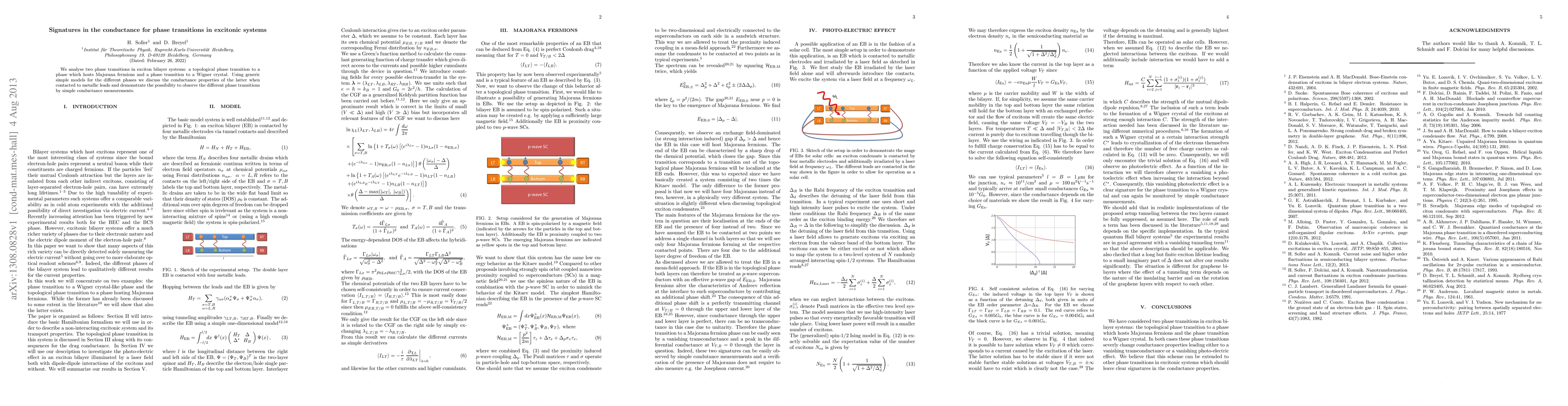 We analyse two phase transitions in exciton bilayer systems: a topological phase transition to a phase which hosts Majorana fermions and a phase transition to a Wigner crystal. Using generic simple models for the different phases we discuss the conductance properties of the latter when contacted to metallic leads and demonstrate the possibility to observe the different phase transitions by simple conductance measurements.