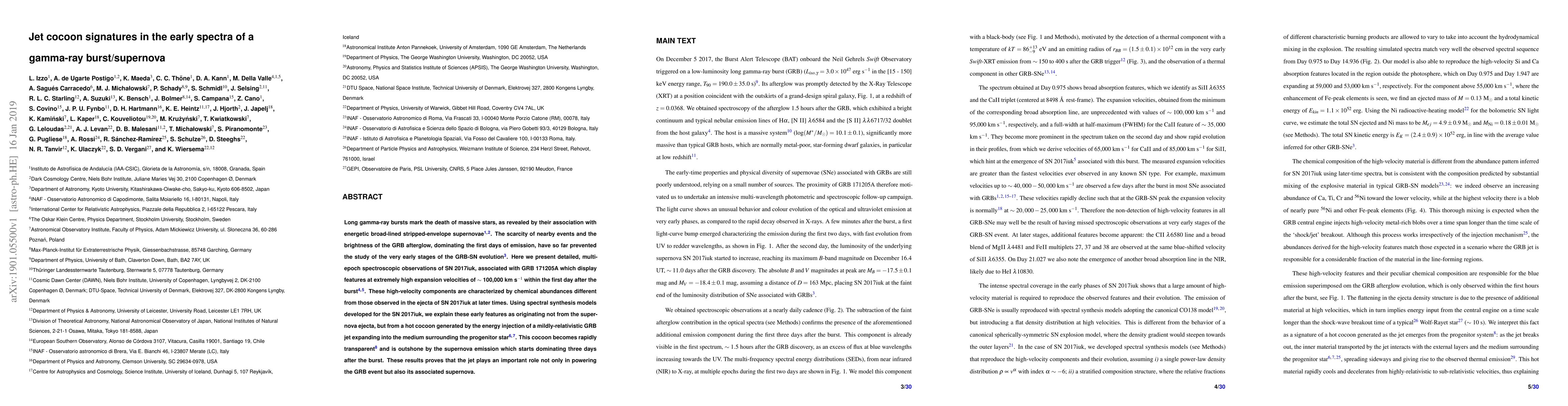 This paper presents spectroscopic observations of SN 2017iuk, a supernova linked to GRB 171205A, revealing high-velocity components within the first day post-burst. These components, with distinct chemical abundances, originate from a jet-generated cocoon, demonstrating the jet's significant role in both the GRB and its associated supernova.