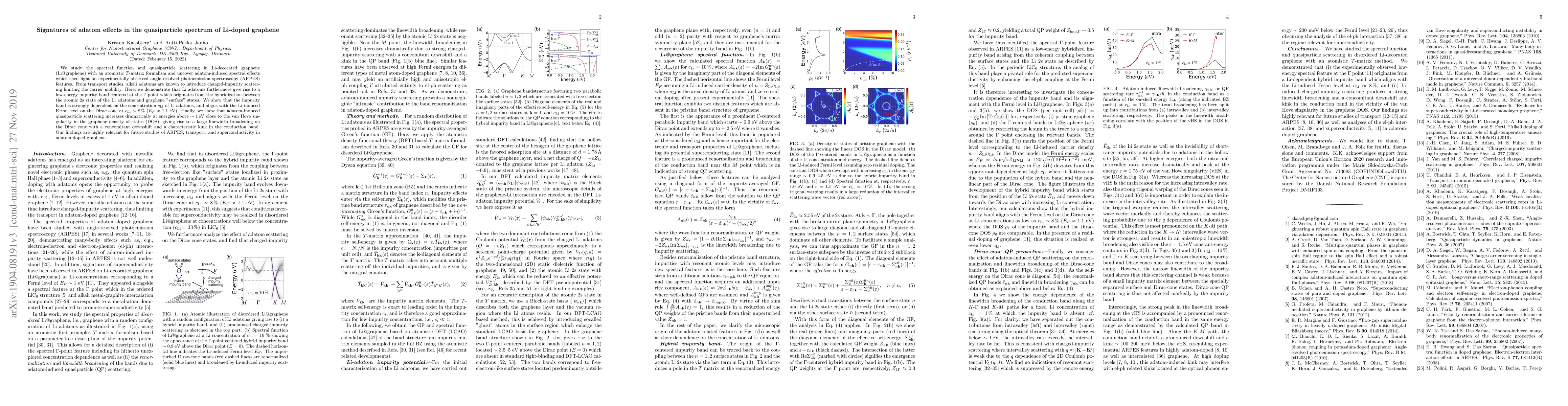 This paper investigates the spectral function and quasiparticle scattering in Li-doped graphene using an atomistic $T$-matrix formalism, revealing an impurity band due to Li adatom hybridization with graphene states. The study highlights significant quasiparticle scattering effects and linewidth broadening near the van Hove singularity, relevant for understanding ARPES and transport properties in adatom-doped graphene.