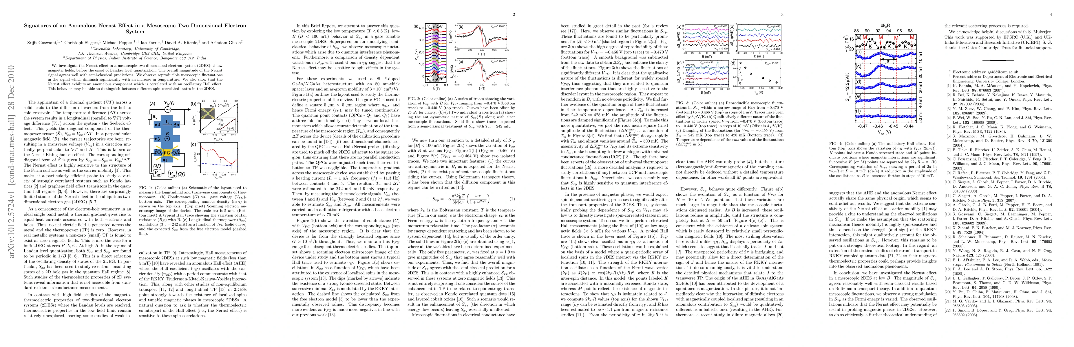 This study investigates the Nernst effect in a mesoscopic two-dimensional electron system, finding semi-classical agreement and anomalous fluctuations correlated with an oscillatory Hall effect, which could differentiate spin-correlated states. Temperature reductions diminish these mesoscopic fluctuations.