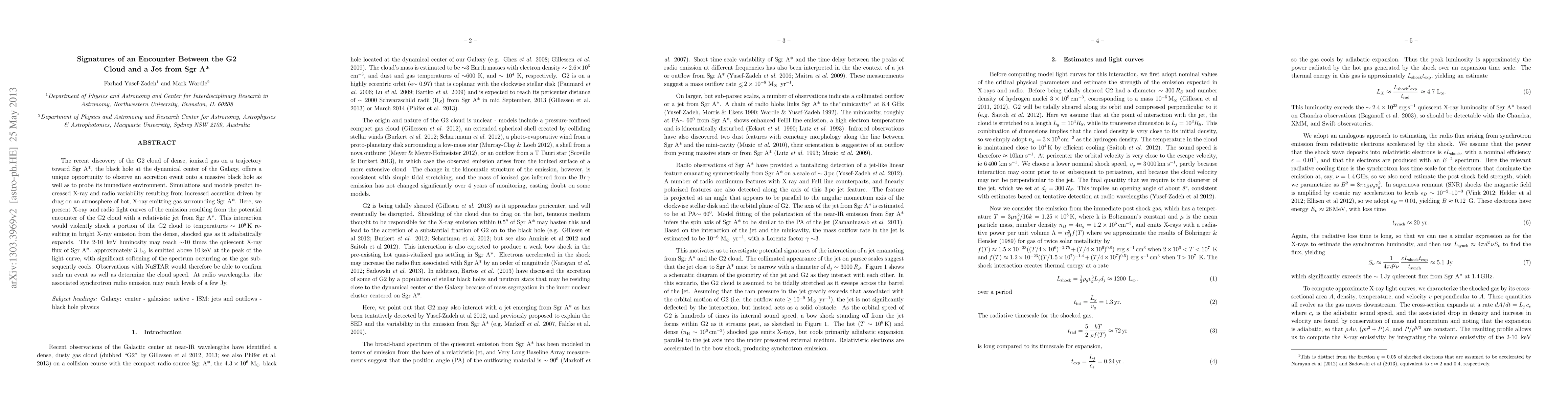 The recent discovery of the G2 cloud of dense, ionized gas on a trajectory toward Sgr A*, the black hole at the dynamical center of the Galaxy, offers a unique opportunity to observe an accretion event onto a massive black hole as well as to probe its immediate environment. Simulations and models predict increased X-ray and radio variability resulting from increased accretion driven by drag on an atmosphere of hot, X-ray emitting gas surrounding Sgr A*. Here, we present X-ray and radio light curves of the emission resulting from the potential encounter of the G2 cloud with a relativistic jet from Sgr A*. This interaction would violently shock a portion of the G2 cloud to temperatures $\sim 10^8$\,K resulting in bright X-ray emission from the dense, shocked gas as it adiabatically expands. The 2-10\, keV luminosity may reach $\sim$10 times the quiescent X-ray flux of Sgr A*. approximately $3\,\lsol$ is emitted above 10\,keV at the peak of the light curve, with significant softening of the spectrum occurring as the gas subsequently cools. Observations with NuSTAR would therefore be able to confirm such an event as well as determine the cloud speed. At radio wavelengths, the associated synchrotron radio emission may reach levels of a few Jy.