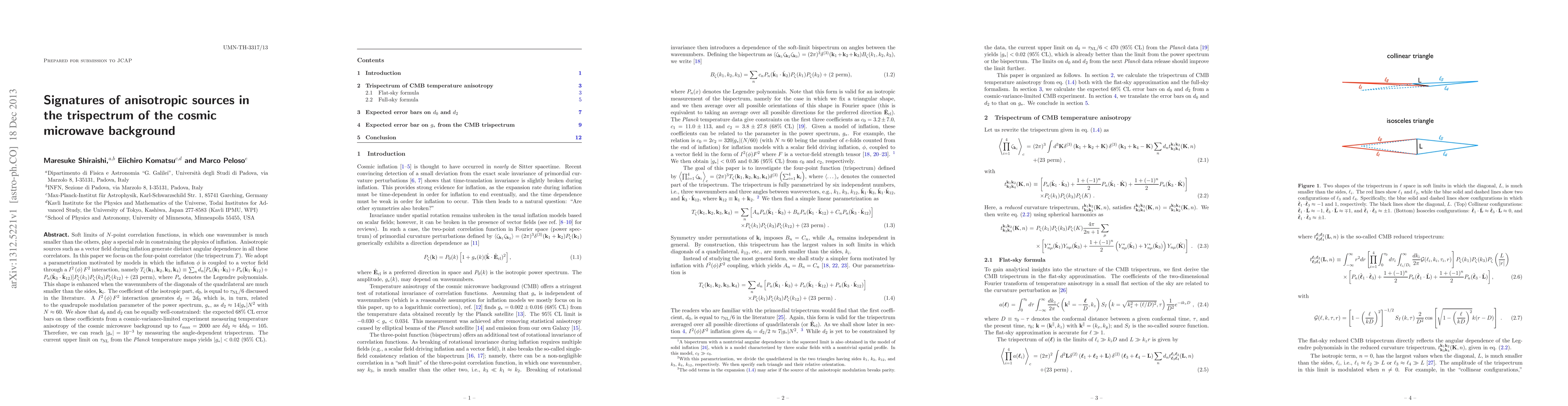 Soft limits of $N$-point correlation functions, in which one wavenumber is much smaller than the others, play a special role in constraining the physics of inflation. Anisotropic sources such as a vector field during inflation generate distinct angular dependence in all these correlators. In this paper we focus on the four-point correlator (the trispectrum $T$). We adopt a parametrization motivated by models in which the inflaton $\phi$ is coupled to a vector field through a $I^2 \left( \phi \right) F^2$ interaction, namely $T_{\zeta}({\bf k}_1, {\bf k}_2, {\bf k}_3, {\bf k}_4) \equiv \sum_n d_n [ P_n(\hat{\bf k}_1 \cdot \hat{\bf k}_3) + P_n(\hat{\bf k}_1 \cdot \hat{\bf k}_{12}) + P_n(\hat{\bf k}_3 \cdot \hat{\bf k}_{12}) ] P_{\zeta}(k_1) P_{\zeta}(k_3) P_\zeta(k_{12}) + (23~{\rm perm})$, where $P_n$ denotes the Legendre polynomials. This shape is enhanced when the wavenumbers of the diagonals of the quadrilateral are much smaller than the sides, ${\bf k}_i$. The coefficient of the isotropic part, $d_0$, is equal to $\tau_{\rm NL}/6$ discussed in the literature. A $I^2 \left( \phi \right) F^2$ interaction generates $d_2 = 2 d_0$ which is, in turn, related to the quadrupole modulation parameter of the power spectrum, $g_*$, as $d_2 \approx 14 |g_*| N^2$ with $N \approx 60$. We show that $d_0$ and $d_2$ can be equally well-constrained: the expected $68 \%$ CL error bars on these coefficients from a cosmic-variance-limited experiment measuring temperature anisotropy of the cosmic microwave background up to $\ell_{\rm max}=2000$ are $\delta d_2 \approx 4 \delta d_0 = 105$. Therefore, we can reach $|g_*|=10^{-3}$ by measuring the angle-dependent trispectrum. The current upper limit on $\tau_{\rm NL}$ from the ${\it Planck}$ temperature maps yields $|g_*|<0.02$ ($95 \%$ CL).
