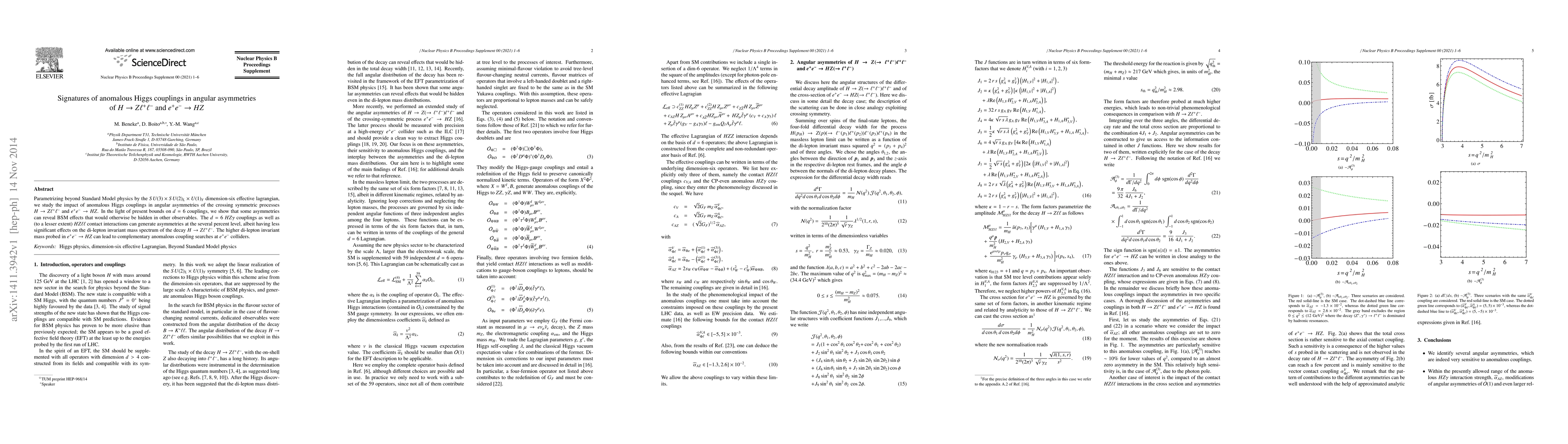 Parametrizing beyond Standard Model physics by the SU(3) x SU(2)_L x U(1)_Y dimension-six effective Lagrangian, we study the impact of anomalous Higgs couplings in angular asymmetries of the crossing-symmetric processes H --> Zl+l- and e+e- --> HZ. In the light of present bounds on d=6 couplings, we show that some asymmetries can reveal BSM effects that would otherwise be hidden in other observables. The d=6 HZgamma couplings as well as (to a lesser extent) HZll contact interactions can generate asymmetries at the several percent level, albeit having less significant effects on the di-lepton invariant mass spectrum of the decay H --> Zl+l-. The higher di-lepton invariant mass probed in e+e- --> HZ can lead to complementary anomalous coupling searches at e+e- colliders.
