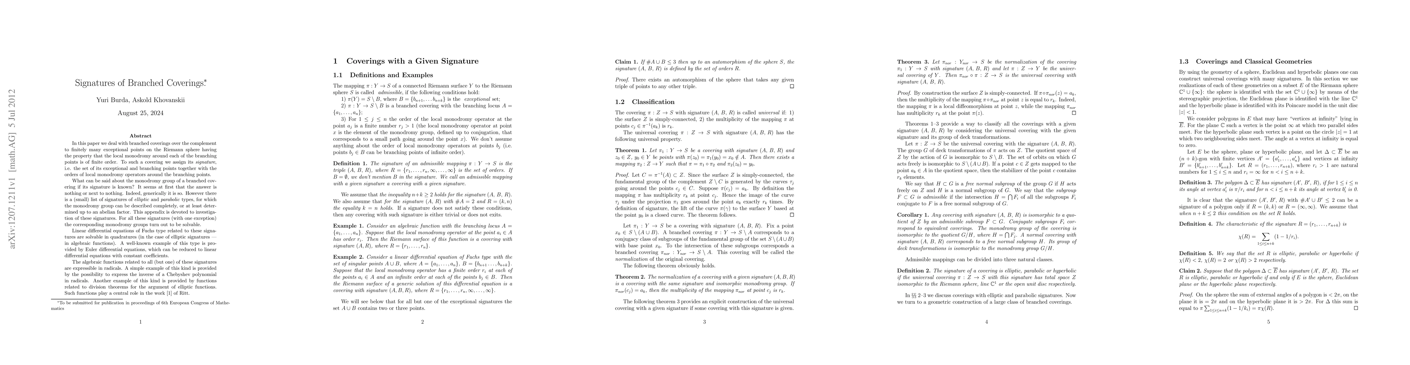 In this paper we deal with branched coverings over the complement to finitely many exceptional points on the Riemann sphere having the property that the local monodromy around each of the branching points is of finite order. To such a covering we assign its \textit{signature}, i.e. the set of its exceptional and branching points together with the orders of local monodromy operators around the branching points. What can be said about the monodromy group of a branched covering if its signature is known? It seems at first that the answer is nothing or next to nothing. Indeed, generically it is so. However there is a (small) list of signatures of \textit{elliptic} and \textit{parabolic} types, for which the monodromy group can be described completely, or at least determined up to an abelian factor. This appendix is devoted to investigation of these signatures. For all these signatures (with one exception) the corresponding monodromy groups turn out to be solvable. Linear differential equations of Fuchs type related to these signatures are solvable in quadratures (in the case of elliptic signatures --- in algebraic functions). A well-known example of this type is provided by Euler differential equations, which can be reduced to linear differential equations with constant coefficients. The algebraic functions related to all (but one) of these signatures are expressible in radicals. A simple example of this kind is provided by the possibility to express the inverse of a Chebyshev polynomial in radicals. Another example of this kind is provided by functions related to division theorems for the argument of elliptic functions. Such functions play a central role in the work [1] of Ritt.