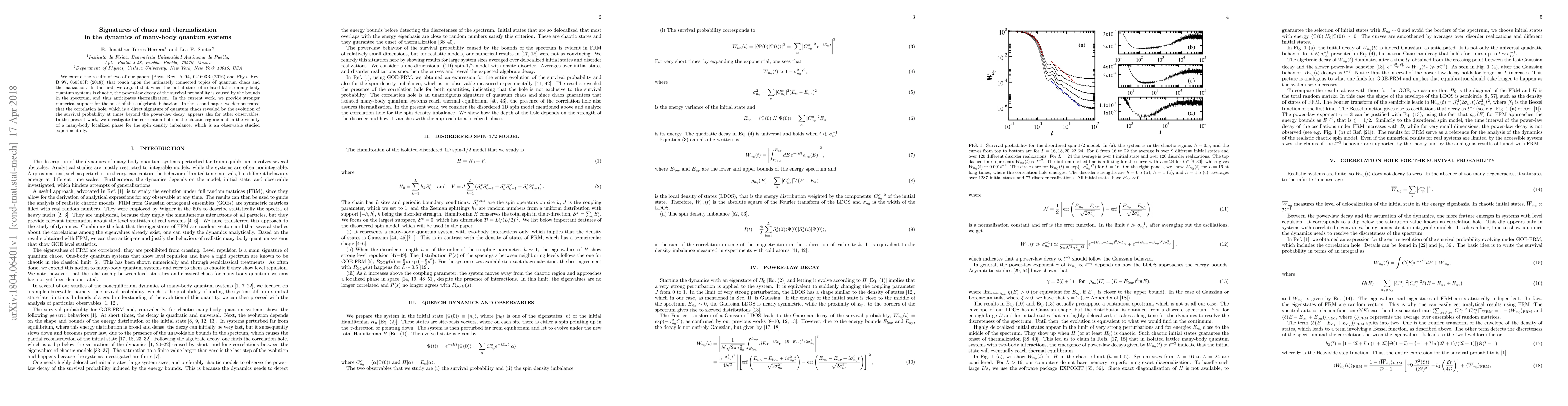 This paper extends previous research on quantum chaos and thermalization in many-body quantum systems, providing stronger numerical evidence that chaotic initial states lead to power-law decay and anticipate thermalization. It further explores the correlation hole, a signature of quantum chaos, in the spin density imbalance observable, both in the chaotic regime and near many-body localized phases.
