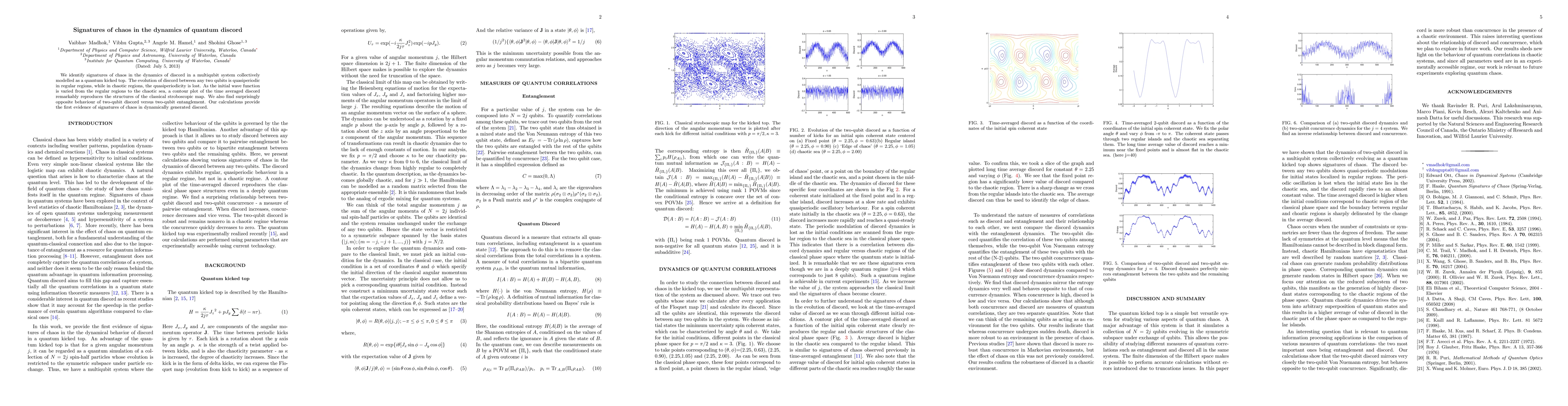 This paper identifies signatures of chaos in the dynamics of quantum discord in a multiqubit system modeled as a quantum kicked top, showing quasiperiodic evolution in regular regions and chaotic loss of quasiperiodicity in chaotic regions. The study reveals that time-averaged discord contours mirror classical stroboscopic maps, and highlights contrasting behaviors between discord and entanglement.