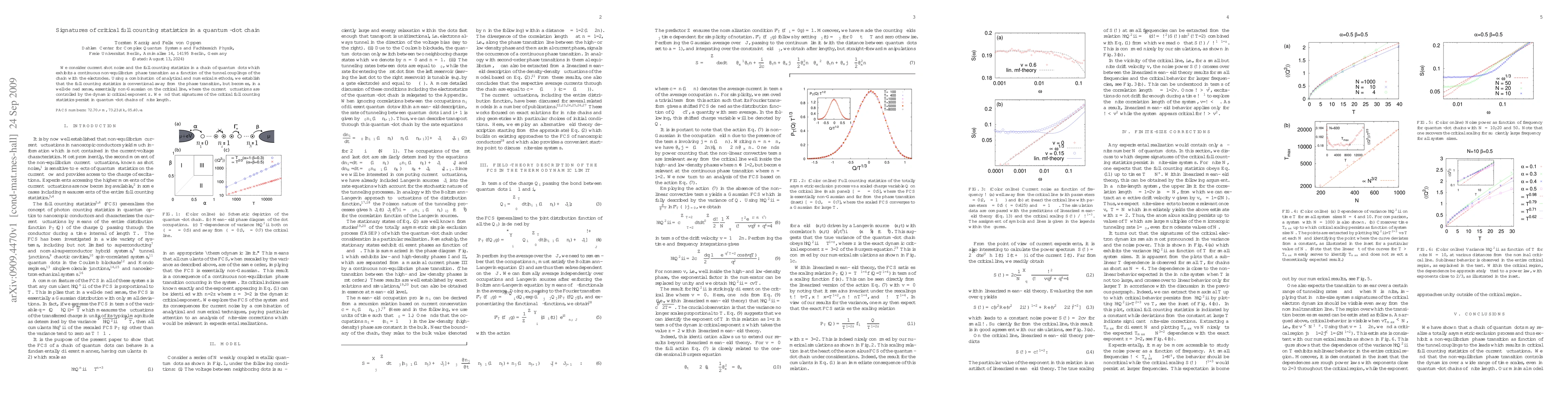 This paper investigates the full counting statistics in quantum-dot chains, revealing conventional statistics away from a continuous phase transition. Near the critical line, the statistics become non-Gaussian, with current fluctuations governed by the dynamic critical exponent $z$, indicating persistent critical signatures in finite-length chains.