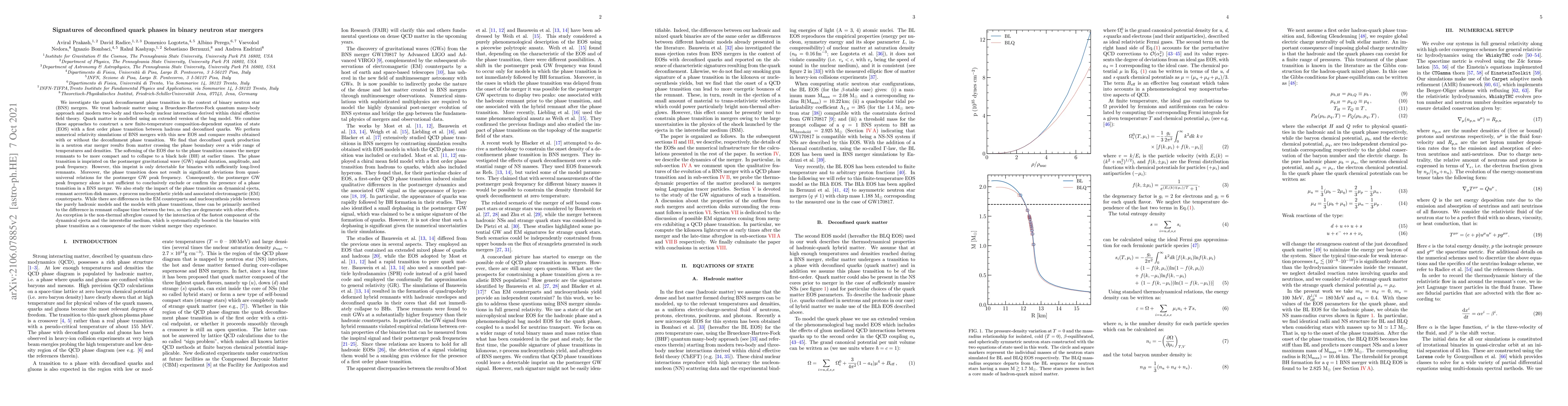 This paper explores the quark deconfinement phase transition in binary neutron star mergers using a new finite-temperature EOS, finding that the transition makes merger remnants more compact and alters gravitational wave signals. The study also notes differences in electromagnetic counterparts and nucleosynthesis yields, particularly in the non-thermal afterglow due to more violent mergers.