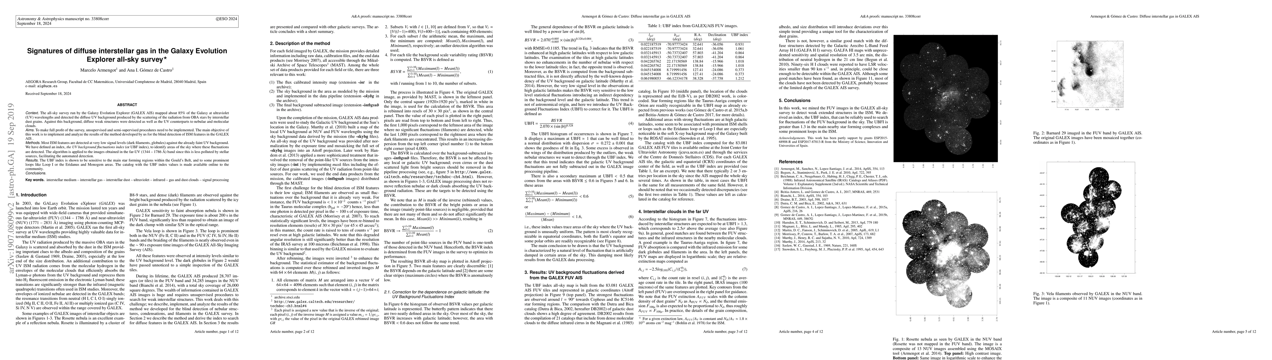 The all sky survey run by the Galaxy Evolution Explorer (GALEX AIS) mapped about 85% of the Galaxy at ultraviolet (UV) wavelengths and detected the diffuse UV background produced by the scattering of the radiation from OBA stars by interstellar dust grains. Against this background, diffuse weak structures are detected as well as the UV counterparts to nebulae and molecular clouds. To make full profit of the survey, unsupervised and semi-supervised procedures need to be implemented. The main objective of this work is to implement and analyze the results of the method developed by us for the blind detection of ISM features in the GALEX AIS . Most ISM features are detected at very low signal levels (dark filaments, globules) against the already faint UV background. We have defined an index, the UV background fluctuations index (or UBF index), to identify areas of the sky where these fluctuations are detected. The algorithm is applied to the images obtained in the FUV (1344 -1786 Angstroms) band since this is less polluted by stellar sources, facilitating the automated detection. The UBF index is shown to be sensitive to the main star forming regions within the Gould's Belt, as well as to some prominent loops like Loop I or the Eridanus and Monogem areas. The catalogue with the UBF index values is made available on-line to the community.