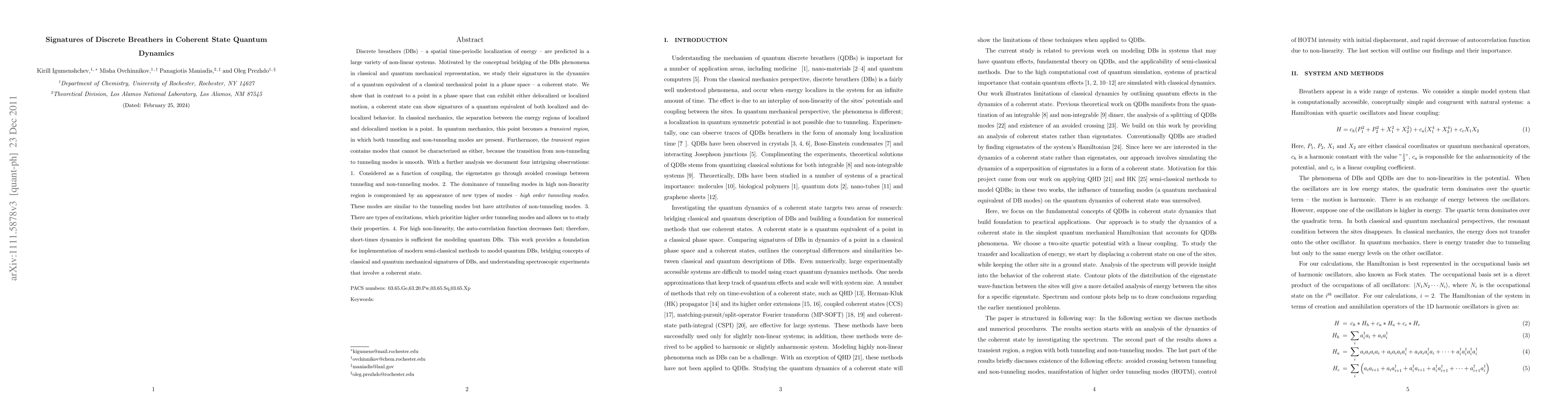 Discrete breathers (DBs) -- a spatial time-periodic localization of energy -- are predicted in a large variety of non-linear systems. Motivated by the conceptual bridging of the DBs phenomena in classical and quantum mechanical representation, we study their signatures in the dynamics of a quantum equivalent of a classical mechanical point in a phase space -- a coherent state. We show that in contrast to a point in a phase space that can exhibit either delocalized or localized motion, a coherent state can show signatures of a quantum equivalent of both localized and delocalized behavior. In classical mechanics, the separation between the energy regions of localized and delocalized motion is a point. In quantum mechanics, this point becomes a transient region, in which both tunneling and non-tunneling modes are present. Furthermore, the transient region contains modes that cannot be characterized as either, because the transition from non-tunneling to tunneling modes is smooth. With a further analysis we document four intriguing observations: 1. Considered as a function of coupling, the eigenstates go through avoided crossings between tunneling and non-tunneling modes. 2. The dominance of tunneling modes in high non-linearity region is compromised by an appearance of new types of modes -- high order tunneling modes. These modes are similar to the tunneling modes but have attributes of non-tunneling modes. ...