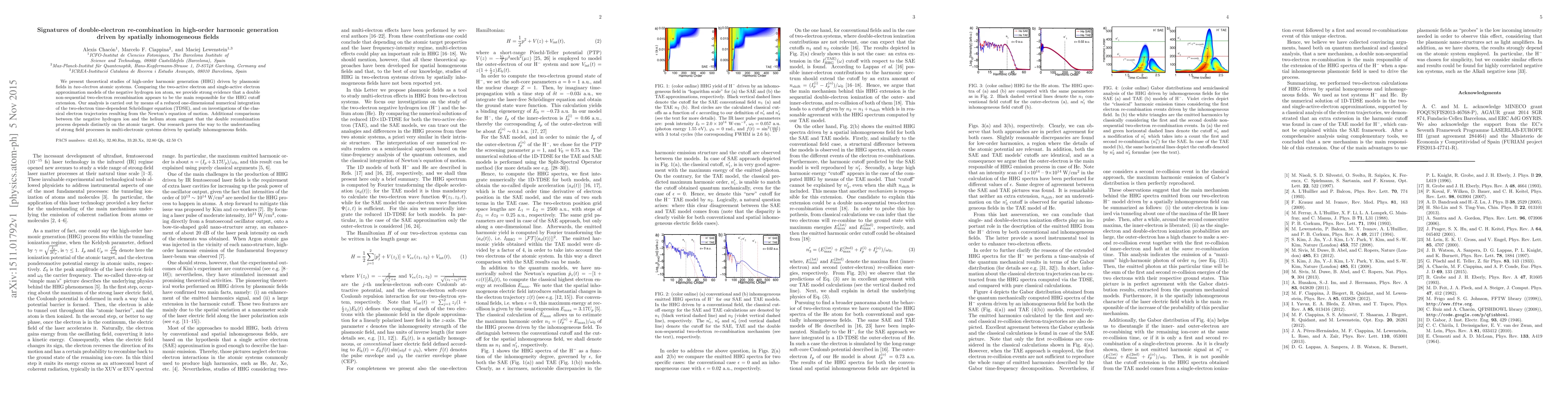 We present theoretical studies of high-order harmonic generation (HHG) driven by plasmonic fields in two-electron atomic systems. Comparing the two-active electron and single-active electron approximation models of the negative hydrogen ion atom, we provide strong evidence that a double non-sequential two-electron recombination appears to be the main responsible for the HHG cutoff extension. Our analysis is carried out by means of a reduced one-dimensional numerical integration of the two-electron time-dependent Schr\"odinger equation (TDSE), and on investigations of the classical electron trajectories resulting from the Newton's equation of motion. Additional comparisons between the negative hydrogen ion and the helium atom suggest that the double recombination process depends distinctly on the atomic target. Our research paves the way to the understanding of strong field processes in multi-electronic systems driven by spatially inhomogeneous fields.