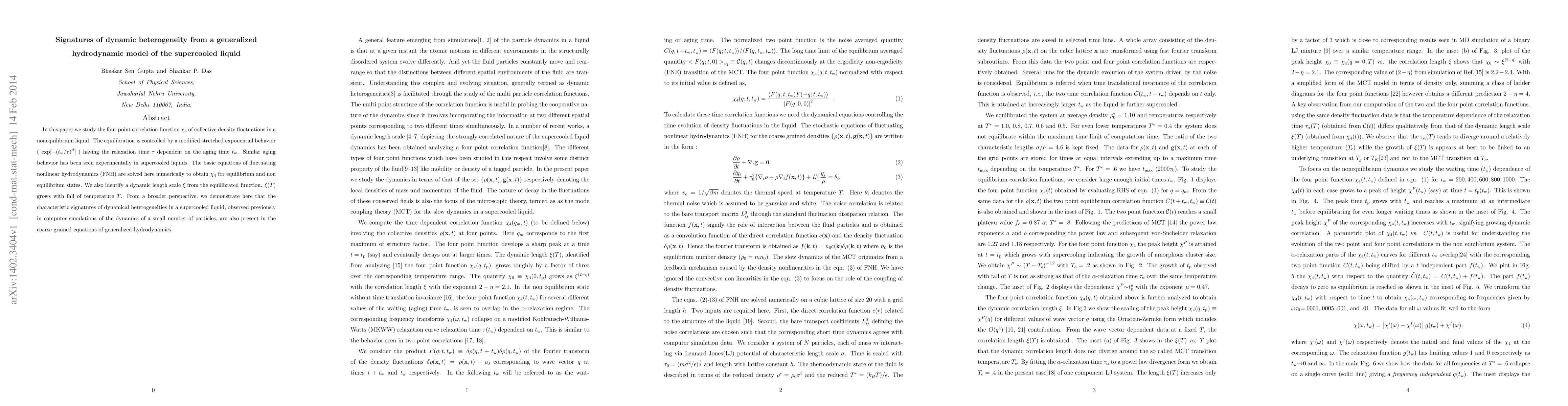 This paper investigates the four-point correlation function $\chi_4$ of density fluctuations in a supercooled liquid using a generalized hydrodynamic model, revealing a modified stretched exponential relaxation behavior dependent on aging time. The study identifies dynamic length scales $\xi$ that grow with decreasing temperature, demonstrating signatures of dynamic heterogeneity in coarse-grained hydrodynamic equations.