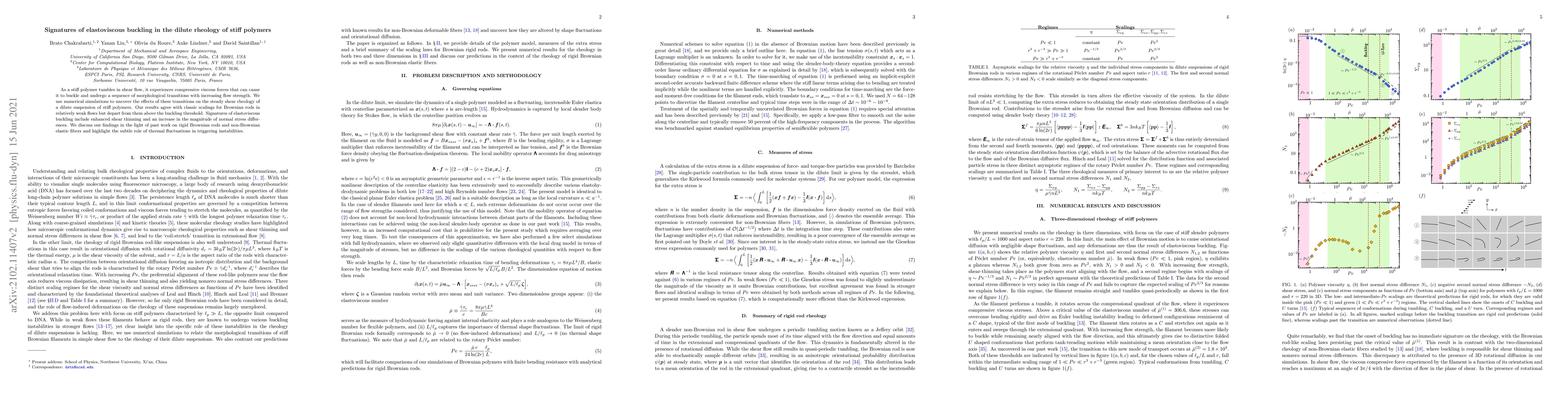This paper investigates the elastoviscous buckling of stiff polymers under shear flow, revealing enhanced shear thinning and increased normal stress differences above the buckling threshold. Numerical simulations show deviations from classic scalings for Brownian rods, emphasizing the role of thermal fluctuations in triggering instabilities.