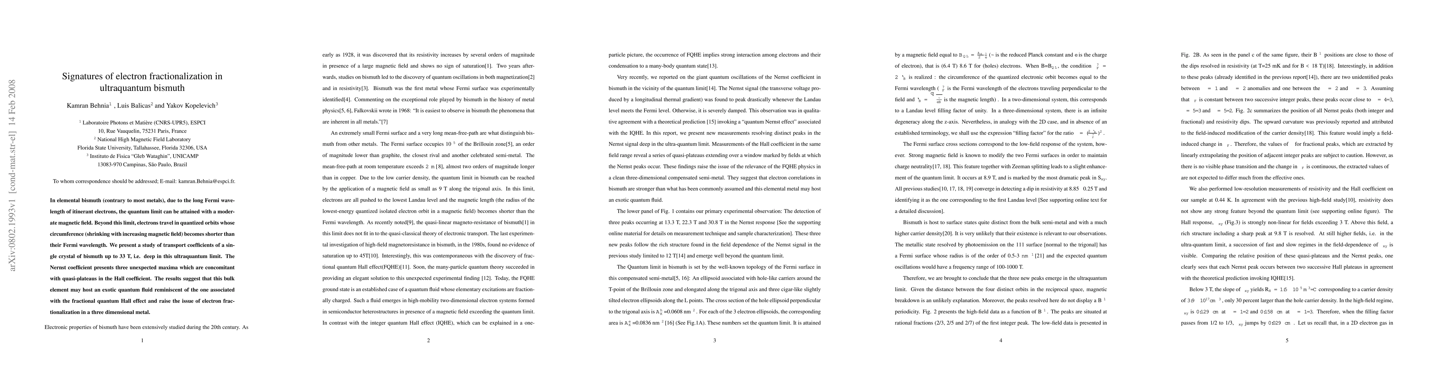 The study investigates the transport properties of bismuth under strong magnetic fields, revealing unexpected maxima in the Nernst coefficient and quasi-plateaus in the Hall coefficient, suggesting electron fractionalization akin to the fractional quantum Hall effect in a three-dimensional metal.