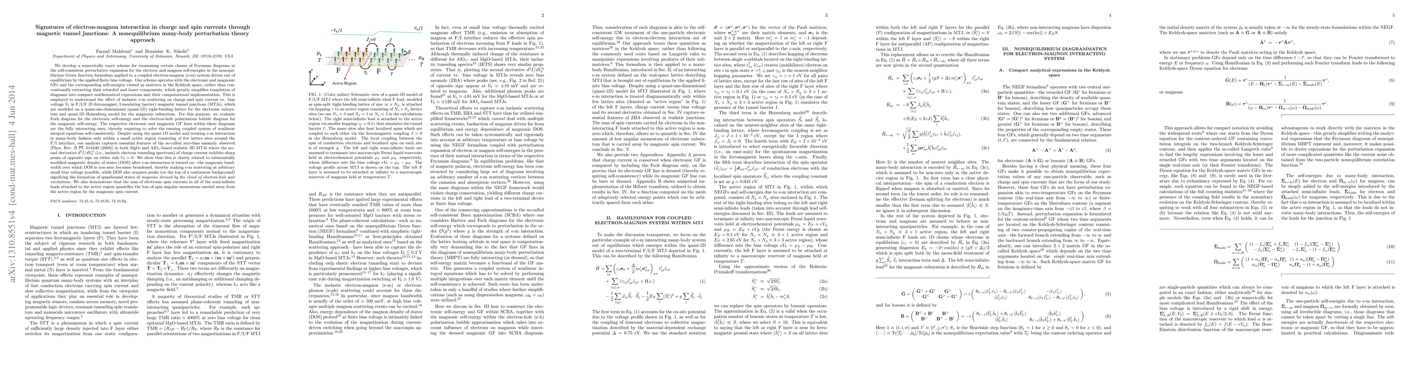 We develop a numerically exact scheme for resumming certain classes of Feynman diagrams in the self-consistent perturbation expansion for the electron and magnon self-energies in the nonequilibrium Green function formalism applied to a coupled electron-magnon (\mbox{e-m}) system which is driven out of equilibrium by the applied finite bias voltage. Our scheme operates with the electronic and magnonic GFs and the corresponding self-energies viewed as matrices in the Keldysh space, rather than conventionally extracting their retarded and lesser components. This is employed to understand the effect of inelastic \mbox{e-m} scattering on charge and spin current vs. bias voltage $V_b$ in F/I/F magnetic tunnel junctions (MTJs), which are modeled on a one-dimensional (1D) tight-binding lattice for the electronic subsystem and 1D Heisenberg model for the magnonic subsystem. For this purpose, we evaluate Fock diagram for the electronic self-energy and the electron-hole polarization bubble diagram for the magnonic self-energy. The respective electronic and magnonic GF lines within these diagrams are the fully interacting ones, thereby requiring to solve the ensuing coupled system of nonlinear integral equations self-consistently. Despite using the 1D model and treating \mbox{e-m} interaction in many-body fashion only within a small active region consisting of few lattice sites around the F/I interface, our analysis captures essential features of the so-called zero-bias anomaly observed in both MgO- and AlO$_x$-based realistic 3D MTJs where the second derivative $d^2 I/dV_b^2$ (i.e., inelastic electron tunneling spectrum) of charge current exhibits sharp peaks of opposite sign on either side of the zero bias voltage.