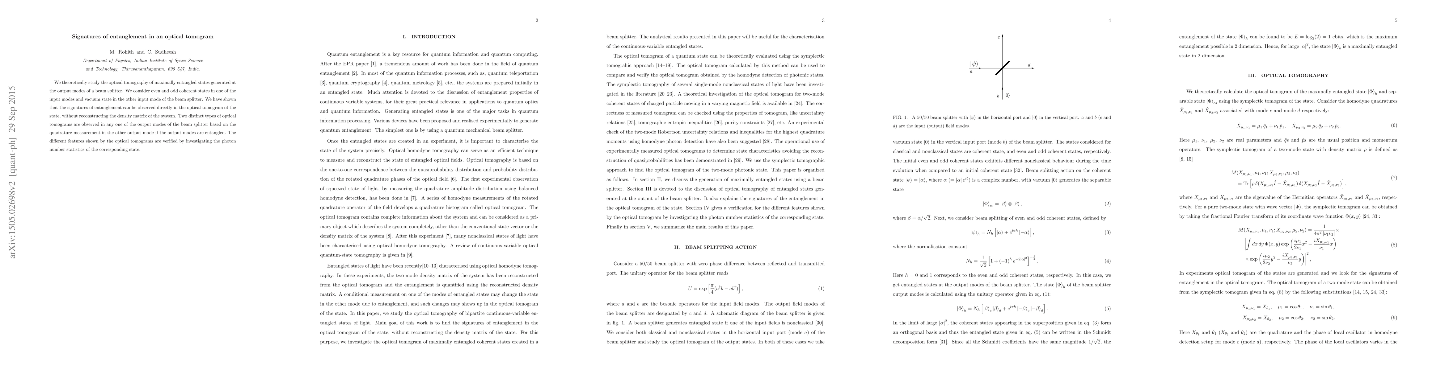 This paper theoretically investigates optical tomography of entangled states from a beam splitter, showing that entanglement signatures can be directly observed in the optical tomogram without reconstructing the density matrix. It reveals two distinct tomogram types based on quadrature measurements, verified through photon number statistics.