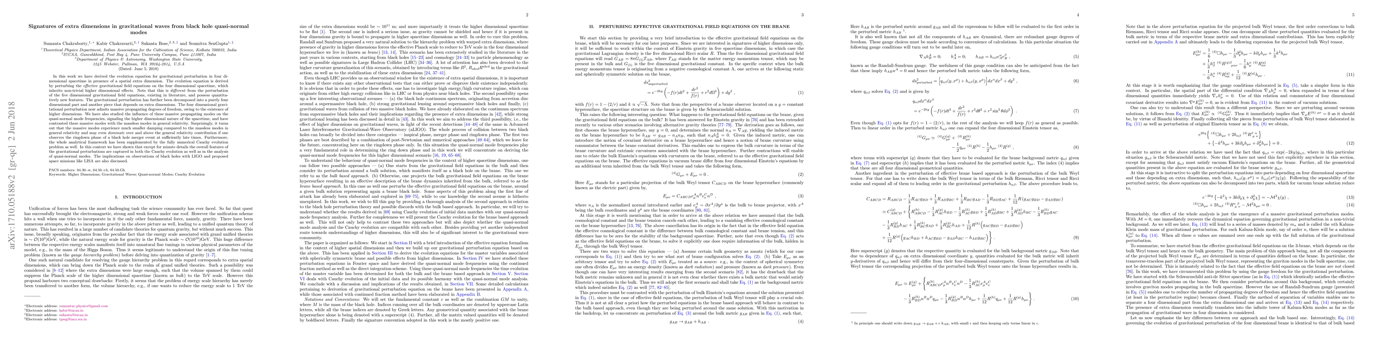 In this work we have derived the evolution equation for gravitational perturbation in four dimensional spacetime in presence of a spatial extra dimension. The evolution equation is derived by perturbing the \emph{effective} gravitational field equations on the four dimensional spacetime, which inherits non-trivial higher dimensional effects. Note that this is \emph{different} from the perturbation of the five dimensional gravitational field equations, existing in literature, and possess quantitatively new features. The gravitational perturbation has further been decomposed into a purely four dimensional part and another piece that depends on extra dimensions. The four dimensional gravitational perturbation now admits massive propagating degrees of freedom, owing to the existence of higher dimensions. We have also studied the influence of these massive propagating modes on the quasi-normal mode frequencies, signaling the higher dimensional nature of the spacetime, and have contrasted these massive modes with the massless modes in general relativity. Surprisingly, it turns out that the massive modes experience much smaller damping compared to the massless modes in general relativity and may even \emph{dominate} over and above the general relativity contribution if one observes the ringdown phase of a black hole merger event at sufficiently late times. Furthermore, the whole analytical framework has been supplemented by the fully numerical Cauchy evolution problem as well. In this context we have shown that except for minute details the overall features of the gravitational perturbations are captured in both the Cauchy evolution as well as in the analysis of quasi-normal modes. The implications on observations of black holes with LIGO and proposed space missions like LISA are also discussed.