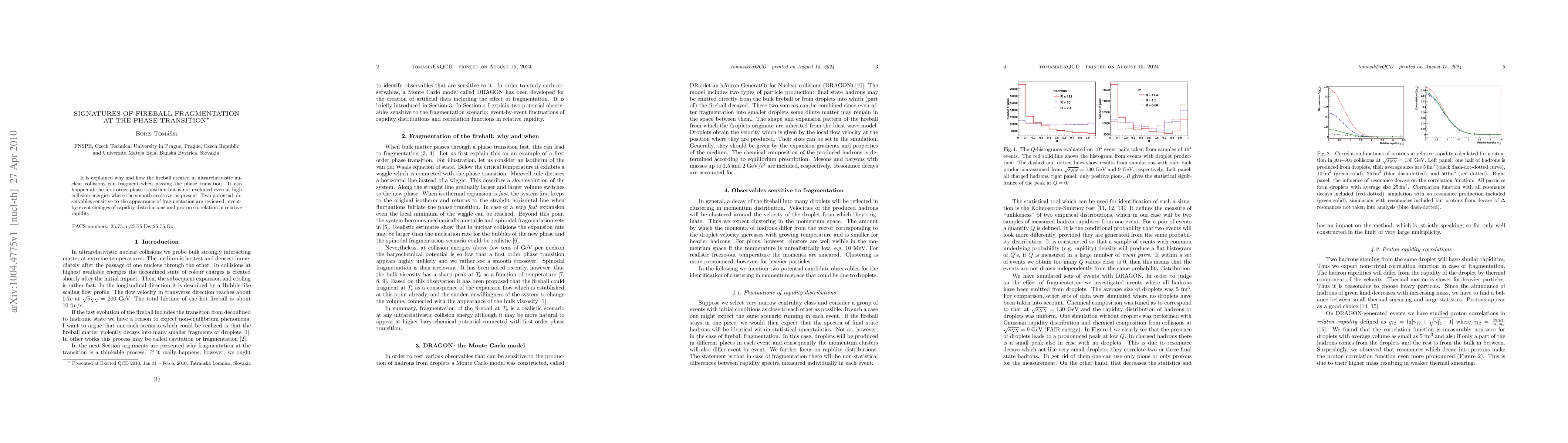 This paper explores the fragmentation of fireballs in ultrarelativistic nuclear collisions during phase transitions, noting that fragmentation can occur even at high collision energies where a smooth crossover is expected. Two key observables discussed are event-by-event changes in rapidity distributions and proton correlation in relative rapidity.