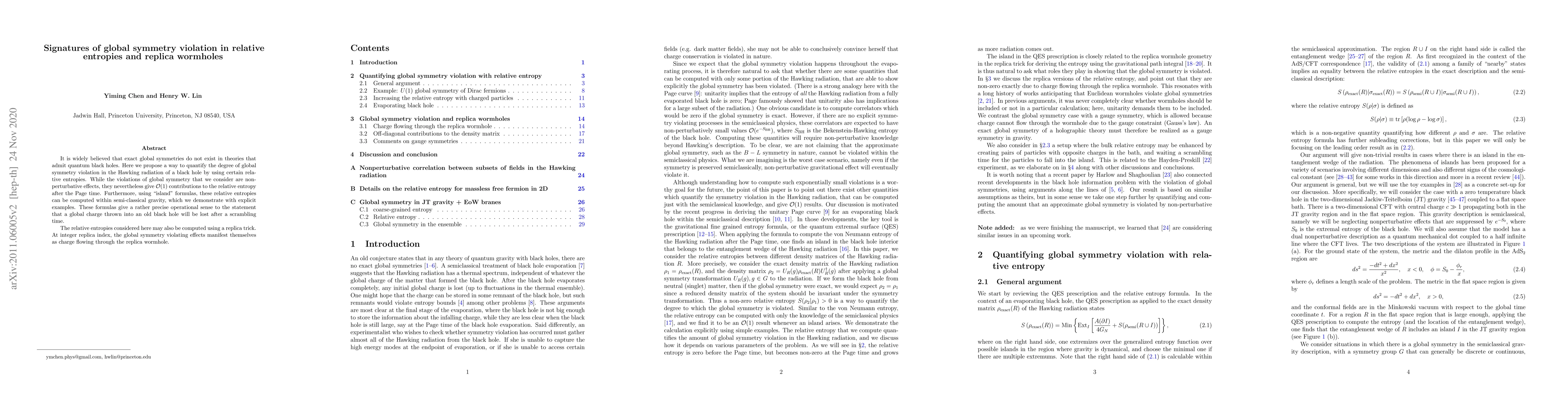 This paper proposes a method to quantify global symmetry violation in Hawking radiation using relative entropies and replica wormholes, showing that non-perturbative effects contribute significantly after the Page time. It demonstrates these effects through semi-classical gravity and replica tricks, providing a precise operational understanding of lost global charges in black holes.