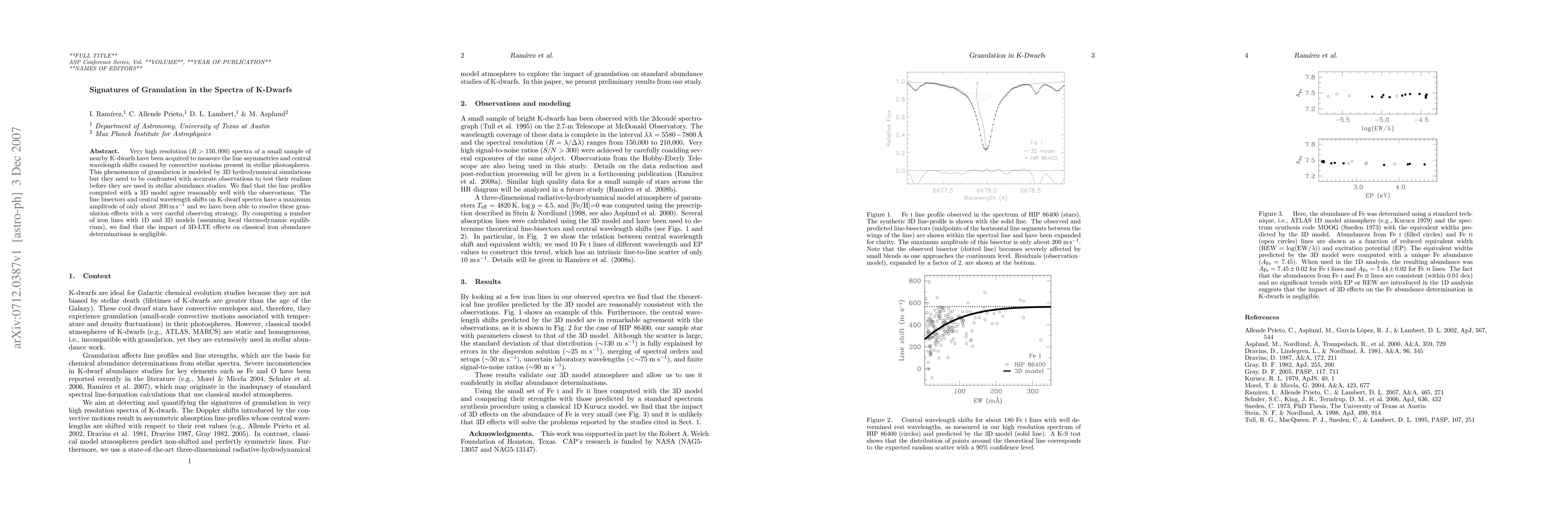 Very high resolution (R>150,000) spectra of a small sample of nearby K-dwarfs have been acquired to measure the line asymmetries and central wavelength shifts caused by convective motions present in stellar photospheres. This phenomenon of granulation is modeled by 3D hydrodynamical simulations but they need to be confronted with accurate observations to test their realism before they are used in stellar abundance studies. We find that the line profiles computed with a 3D model agree reasonably well with the observations. The line bisectors and central wavelength shifts on K-dwarf spectra have a maximum amplitude of only about 200 m/s and we have been able to resolve these granulation effects with a very careful observing strategy. By computing a number of iron lines with 1D and 3D models (assuming local thermodynamic equilibrium), we find that the impact of 3D-LTE effects on classical iron abundance determinations is negligible.