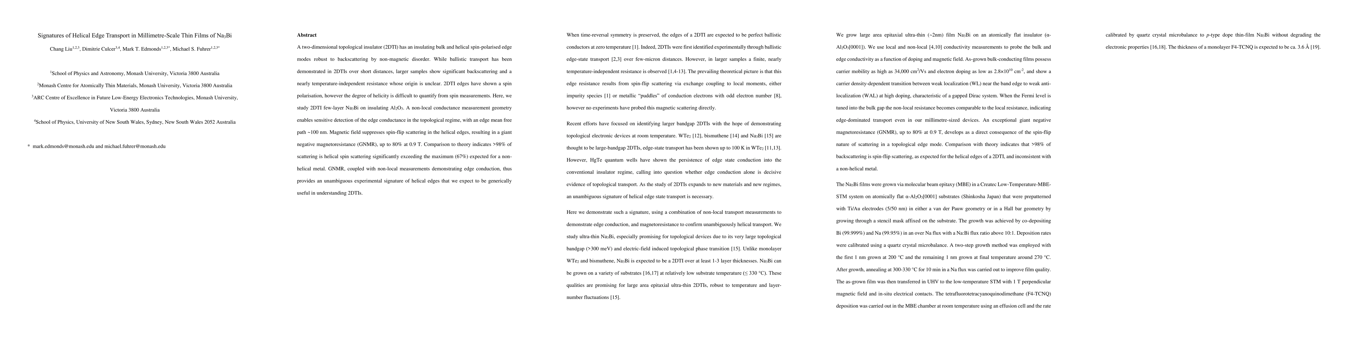 A two-dimensional topological insulator (2DTI) has an insulating bulk and helical spin-polarised edge modes robust to backscattering by non-magnetic disorder. While ballistic transport has been demonstrated in 2DTIs over short distances, larger samples show significant backscattering and a nearly temperature-independent resistance whose origin is unclear. 2DTI edges have shown a spin polarisation, however the degree of helicity is difficult to quantify from spin measurements. Here, we study 2DTI few-layer Na3Bi on insulating Al2O3. A non-local conductance measurement geometry enables sensitive detection of the edge conductance in the topological regime, with an edge mean free path ~100 nm. Magnetic field suppresses spin-flip scattering in the helical edges, resulting in a giant negative magnetoresistance (GNMR), up to 80% at 0.9 T. Comparison to theory indicates >98% of scattering is helical spin scattering significantly exceeding the maximum (67%) expected for a non-helical metal. GNMR, coupled with non-local measurements demonstrating edge conduction, thus provides an unambiguous experimental signature of helical edges that we expect to be generically useful in understanding 2DTIs.