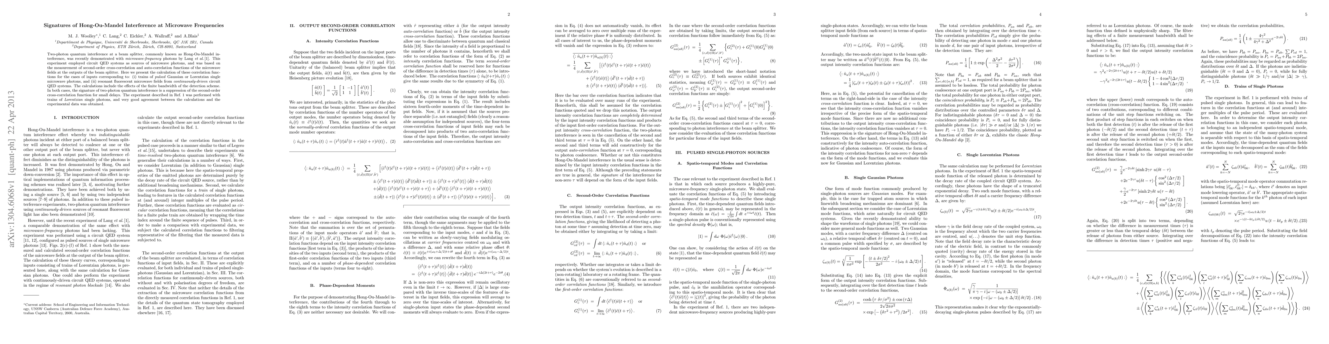 This paper demonstrates Hong-Ou-Mandel interference at microwave frequencies using circuit QED systems, showing two-photon quantum interference through calculated second-order correlation functions. The experiment aligns well with theoretical predictions for both pulsed and continuously-driven microwave photon sources.