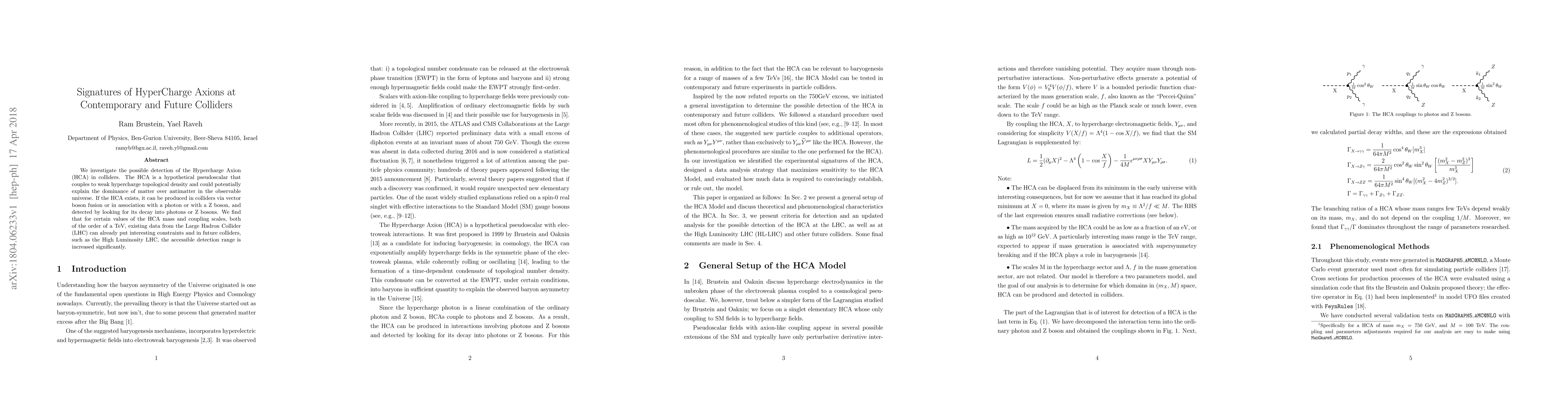 We investigate the possible detection of the Hypercharge Axion (HCA) in colliders. The HCA is a hypothetical pseudoscalar that couples to weak hypercharge topological density and could potentially explain the dominance of matter over antimatter in the observable universe. If the HCA exists, it can be produced in colliders via vector boson fusion or in association with a photon or with a Z boson, and detected by looking for its decay into photons or Z bosons. We find that for certain values of the HCA mass and coupling scales, both of the order of a TeV, existing data from the Large Hadron Collider (LHC) can already put interesting constraints and in future colliders, such as the High Luminosity LHC, the accessible detection range is increased significantly.