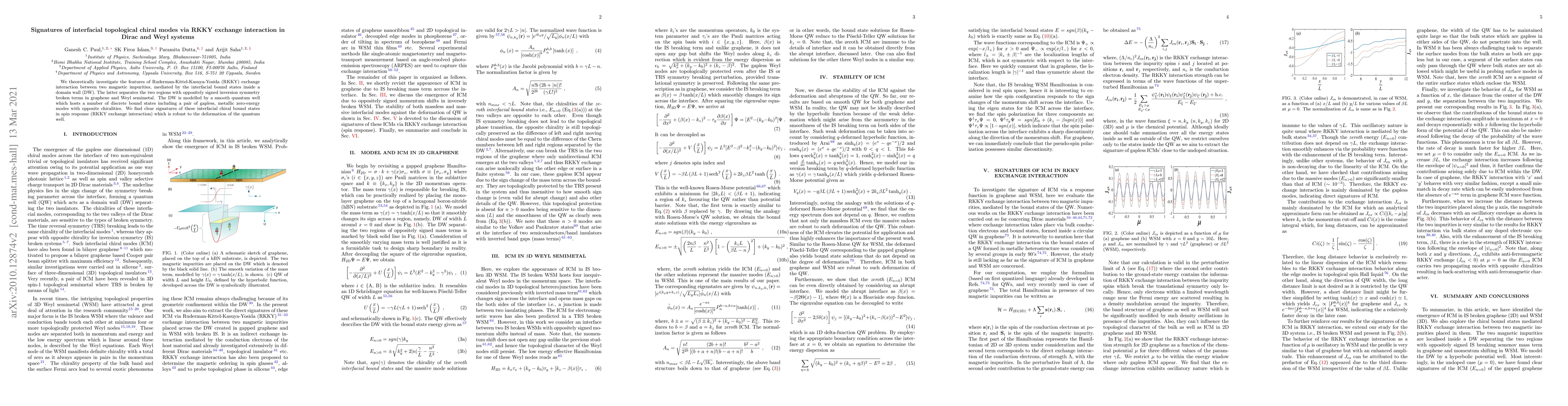 We theoretically investigate the features of Ruderman-Kittel-Kasuya-Yosida (RKKY) exchange interaction between two magnetic impurities, mediated by the interfacial bound states inside a domain wall (DW). The latter separates the two regions with oppositely signed inversion symmetry broken terms in graphene and Weyl semimetal. The DW is modelled by a smooth quantum well which hosts a number of discrete bound states including a pair of gapless, metallic zero-energy modes with opposite chiralities. We find clear signatures of these interfacial chiral bound states in spin response (RKKY exchange interaction) which is robust to the deformation of the quantum well.