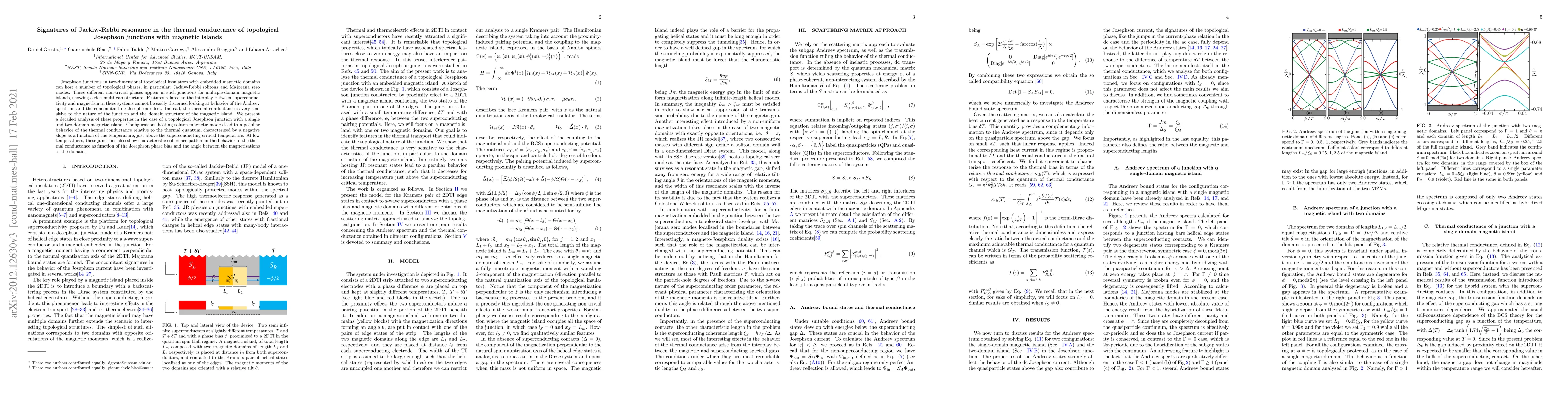 This paper investigates the thermal conductance of topological Josephson junctions with magnetic islands, revealing signatures of Jackiw-Rebbi solitons. It finds that thermal conductance exhibits a negative slope above the superconducting critical temperature and coherence patterns at low temperatures, indicating the influence of superconductivity and magnetism interplay.