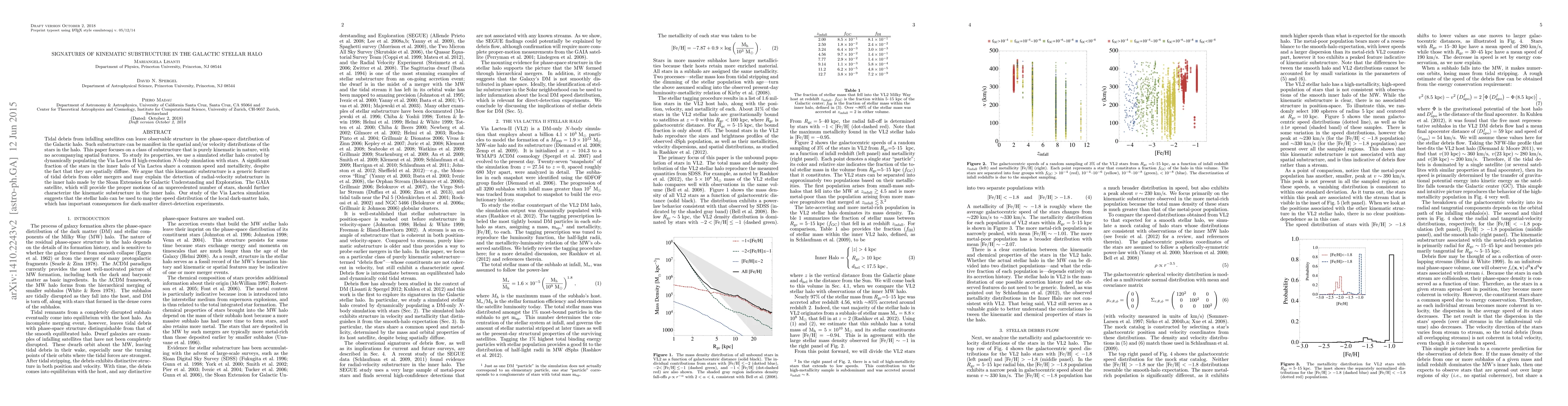 This paper investigates purely kinematic substructure in the Galactic stellar halo, finding that tidal debris from infalling satellites creates common speed and metallicity patterns among stars despite their spatial dispersion. The study uses the Via Lactea II simulation to suggest that this feature may explain observed radial-velocity substructures and has implications for dark-matter detection experiments.