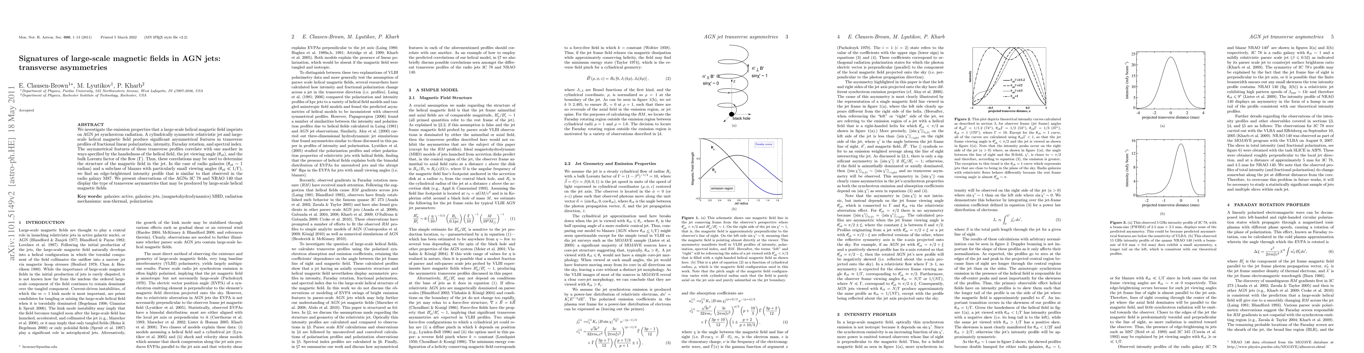 This paper explores how large-scale helical magnetic fields in AGN jets create transverse asymmetries in synchrotron radiation, affecting polarization, intensity, Faraday rotation, and spectral index. These asymmetries correlate with the magnetic field's handedness, viewing angle, and jet's Lorentz factor, providing a method to infer magnetic field structures. Observations of AGNs 3C 78 and NRAO 140 show transverse asymmetries consistent with such magnetic fields.