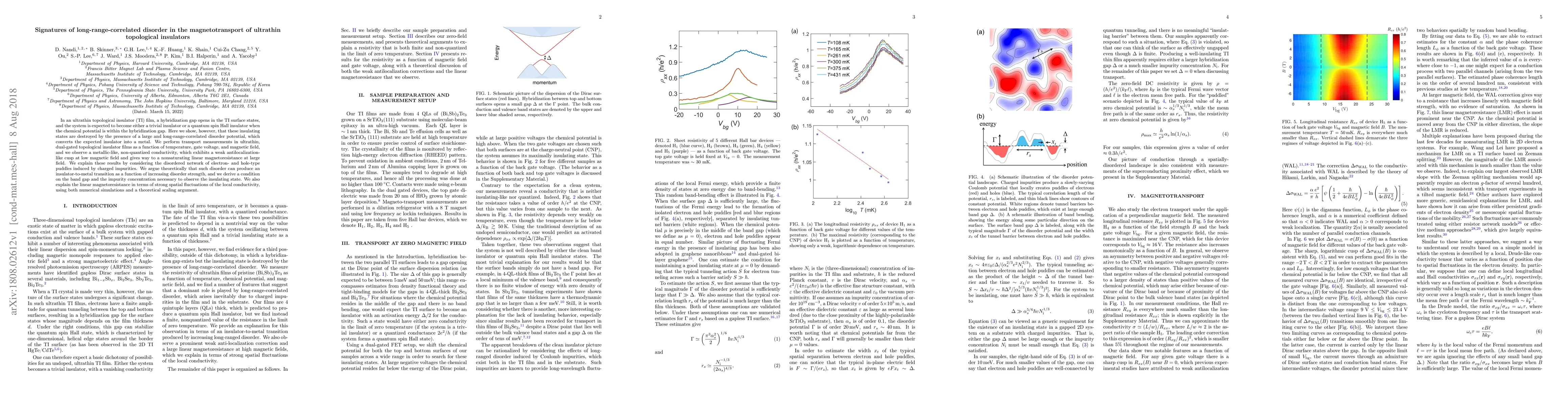 This paper investigates the magnetotransport properties of ultrathin topological insulator films, revealing that long-range-correlated disorder disrupts insulating states, converting them into metallic behavior. The study combines experimental transport measurements with theoretical analysis to explain the observed metallic-like conductivity and linear magnetoresistance due to a network of puddles induced by charged impurities.
