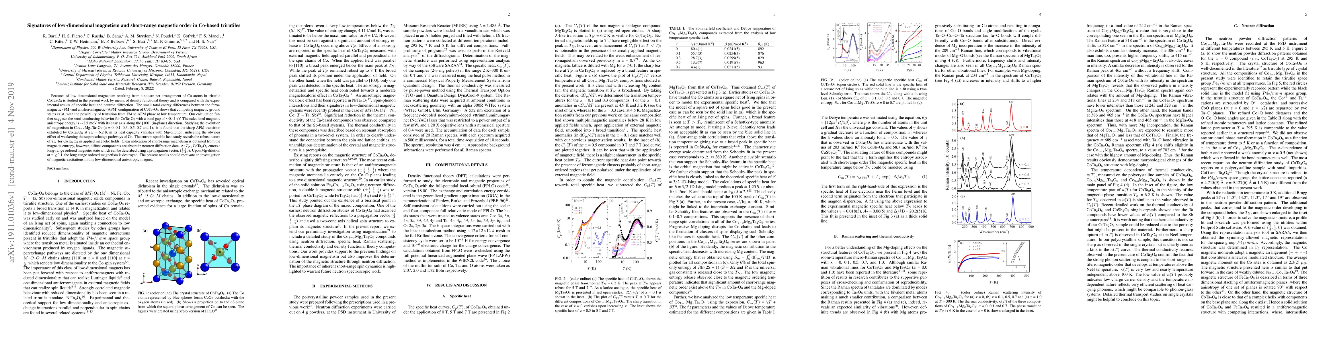 Features of low dimensional magnetism resulting from a square-net arrangement of Co atoms in trirutile CoTa$_2$O$_6$ is studied in the present work by means of density functional theory and is compared with the experimental results of specific heat and neutron diffraction. The small total energy differences between the ferromagnetic (FM) and antiferromagnetic (AFM) configuration of CoTa$_2$O$_6$ shows that competing magnetic ground states exist, with the possibility of transition from FM to AFM phase at low temperature. Our calculation further suggests the semi-conducting behavior for CoTa$_2$O$_6$ with a band gap of $\sim$0.41 eV. The calculated magnetic anisotropy energy is $\sim$2.5 meV with its easy axis along the [100] (in-plane) direction. Studying the evolution of magnetism in Co$_{1-x}$Mg$_x$Ta$_2$O$_6$ (x = 0, 0.1, 0.3, 0.5, 0.7 and 1). it is found that the sharp AFM transition exhibited by CoTa$_2$O$_6$ at $T_N$ = 6.2 K in its heat capacity vanishes with Mg-dilution, indicating the obvious effect of weakening the superexchange pathways of Co. The current specific heat study reveals the robust nature of $T_N$ for CoTa$_2$O$_6$ in applied magnetic fields. Clear indication of short-range magnetism is obtained from the magnetic entropy, however, diffuse components are absent in neutron diffraction data. At $T_N$, CoTa$_2$O$_6$ enters a long-range ordered magnetic state which can be described using a propagation vector, (1/4, 1/4, 0). Upon Mg-dilution at $x \geq$0.1, the long-range ordered magnetism is destroyed. The present results should motivate an investigation of magnetic excitations in this low-dimensional anisotropic magnet.