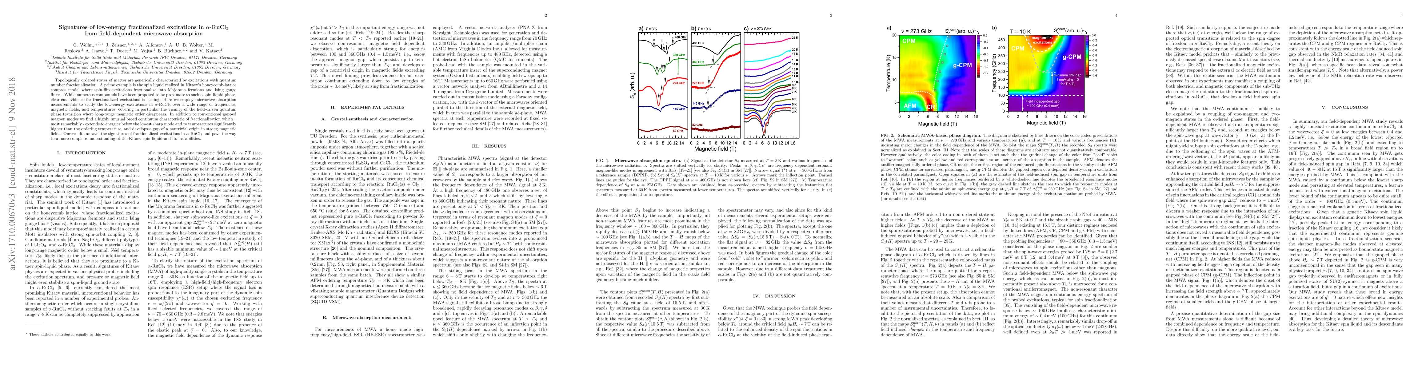 This study reveals signatures of fractionalized excitations in $\alpha$-RuCl$_3$ via field-dependent microwave absorption, identifying a broad continuum indicative of quantum number fractionalization extending below conventional modes and into higher temperatures. These findings provide crucial evidence for the presence of fractionalized excitations, advancing the understanding of the Kitaev spin liquid.