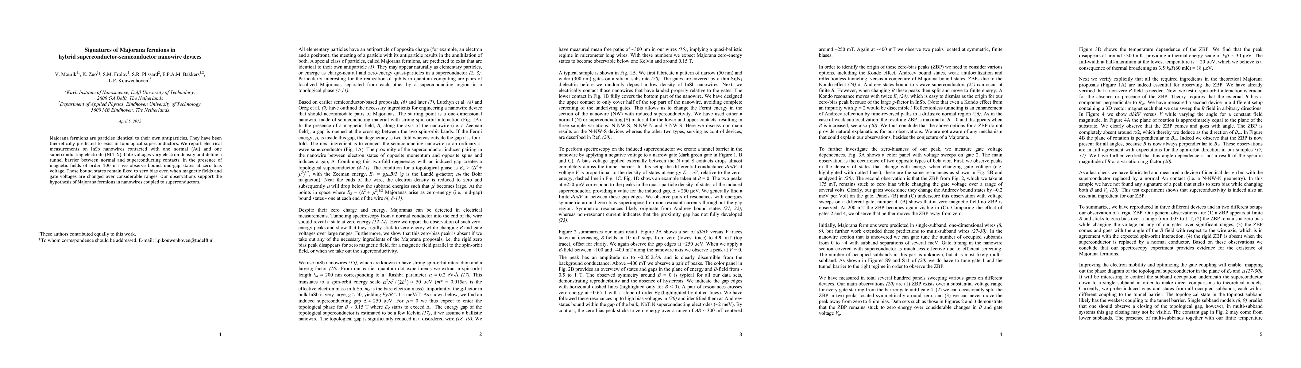 Majorana fermions are particles identical to their own antiparticles. They have been theoretically predicted to exist in topological superconductors. We report electrical measurements on InSb nanowires contacted with one normal (Au) and one superconducting electrode (NbTiN). Gate voltages vary electron density and define a tunnel barrier between normal and superconducting contacts. In the presence of magnetic fields of order 100 mT we observe bound, mid-gap states at zero bias voltage. These bound states remain fixed to zero bias even when magnetic fields and gate voltages are changed over considerable ranges. Our observations support the hypothesis of Majorana fermions in nanowires coupled to superconductors.