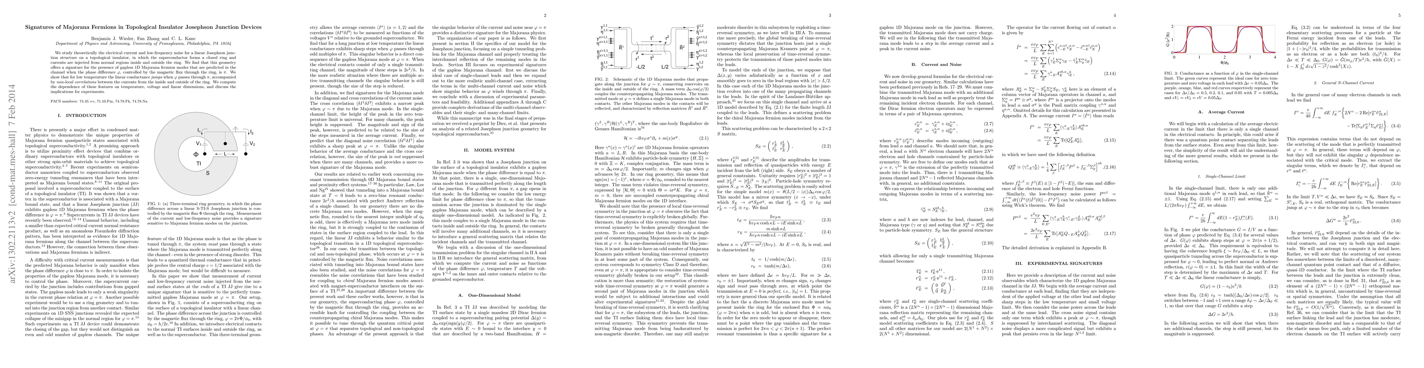 We study theoretically the electrical current and low-frequency noise for a linear Josephson junction structure on a topological insulator, in which the superconductor forms a closed ring and currents are injected from normal regions inside and outside the ring. We find that this geometry offers a signature for the presence of gapless 1D Majorana fermion modes that are predicted in the channel when the phase difference \phi, controlled by the magnetic flux through the ring, is \pi. We show that for low temperature the linear conductance jumps when \phi\ passes through \pi, accompanied by non-local correlations between the currents from the inside and outside of the ring. We compute the dependence of these features on temperature, voltage and linear dimensions, and discuss the implications for experiments.