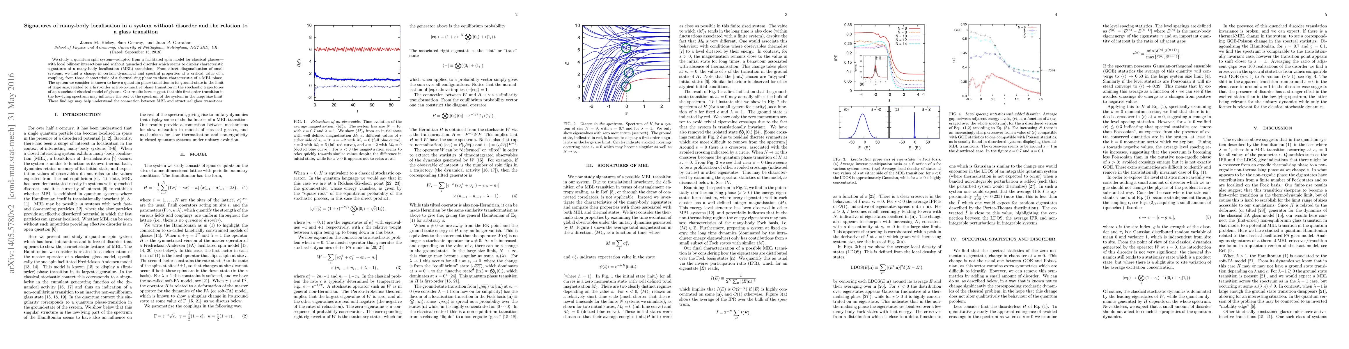 We study a quantum spin system with local bilinear interactions and without quenched disorder which seems to display characteristic signatures of a many-body localisation (MBL) transition. From direct diagonalisation of small systems, we find a change in certain dynamical and spectral properties at a critical value of a coupling, from those characteristic of a thermalising phase to those characteristic of a MBL phase. The system we consider is known to have a quantum phase transition in its ground-state in the limit of large size, related to a first-order active-to-inactive phase transition in the stochastic trajectories of an associated classical model of glasses. Our results here suggest that this transition is present throughout the spectrum of the system in the large size limit. These findings may help understand the connection between MBL and structural glass transitions.