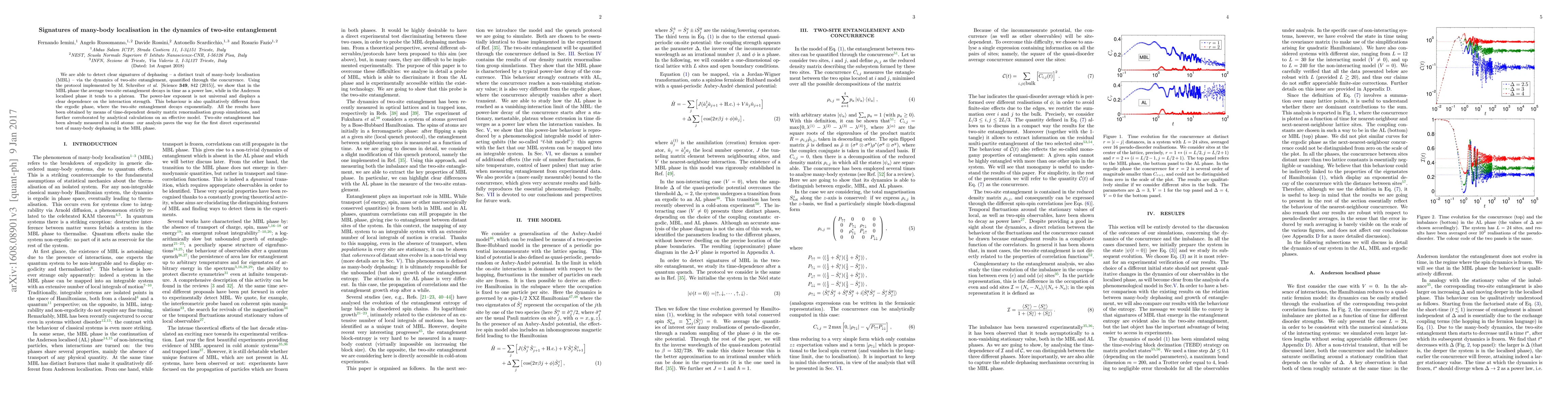 We are able to detect clear signatures of dephasing -- a distinct trait of Many-Body Localisation (MBL) -- via the dynamics of two-sites entanglement, quantified through the concurrence. Using the protocol implemented in [Science {\bf 349}, 842 (2015)] we show that -- in the MBL phase -- the average two-site entanglement decays in time as a power law, while in the Anderson localised phase it tends to a plateau. The exponent of the power law is not universal and shows a clear dependence on the strength of the interaction. This behaviour is also qualitatively different in the ergodic phase where the two-site entanglement decays exponentially. All the results are obtained by means of time-dependent density matrix renormalisation group simulations; they are corroborated by analytical calculations on an effective model. Two-site entanglement has been already measured in cold atoms: Our analysis paves the way for the first direct experimental test of many-body dephasing in the MBL phase.