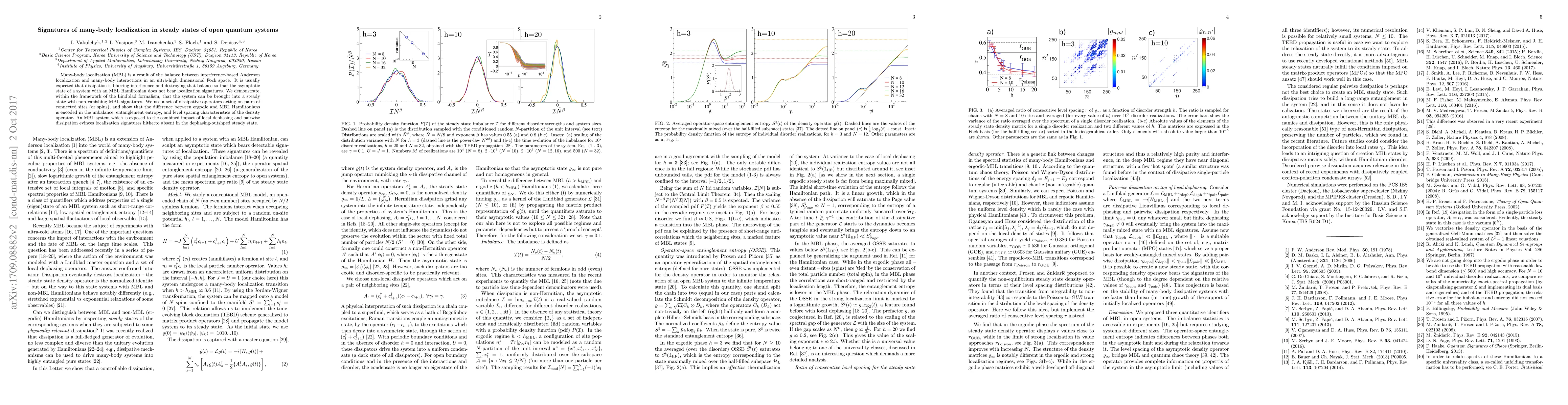 This paper demonstrates that many-body localization (MBL) signatures can persist in steady states of open quantum systems despite dissipation, using the Lindblad formalism. It shows that local dephasing and pairwise dissipative processes can maintain MBL characteristics, evidenced by imbalance, entanglement entropy, and level spacing in the density operator.