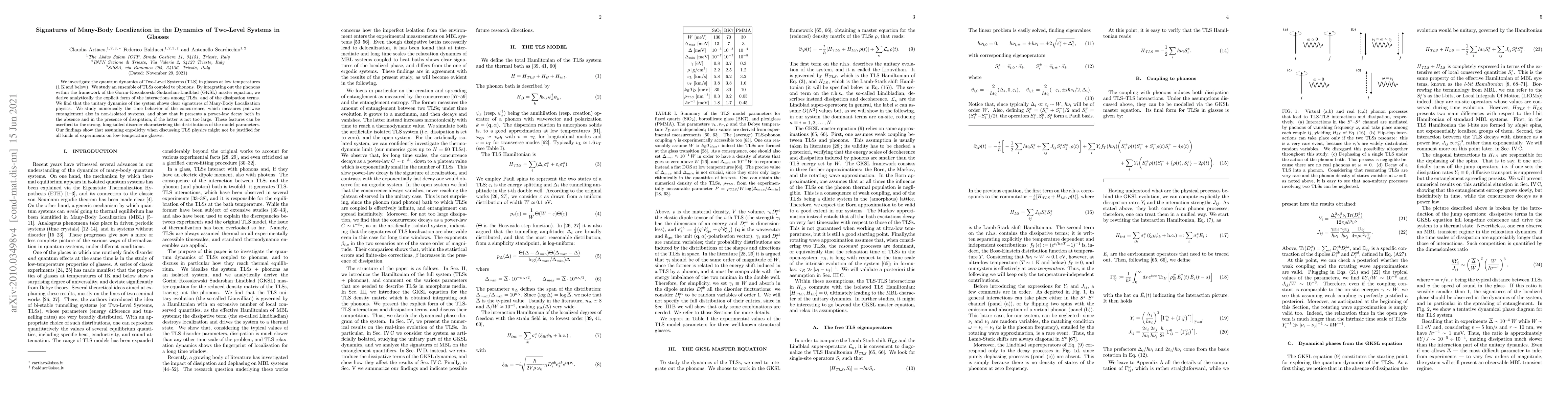 This paper investigates the quantum dynamics of Two-Level Systems (TLS) in glasses at low temperatures, revealing signatures of Many-Body Localization through analytical and numerical methods. It finds that the concurrence, a measure of entanglement, decays as a power-law, indicating that ergodicity assumptions may not hold for all low-temperature glass experiments.