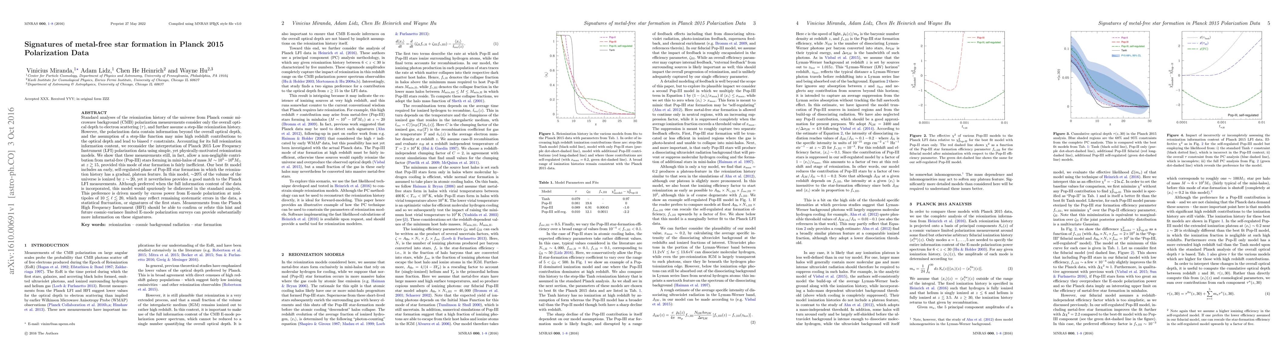 Standard analyses of the reionization history of the universe from Planck cosmic microwave background (CMB) polarization measurements consider only the overall optical depth to electron scattering ($\tau$), and further assume a step-like reionization history. However, the polarization data contain information beyond the overall optical depth, and the assumption of a step-like function may miss high redshift contributions to the optical depth and lead to biased $\tau$ constraints. Accounting for its full reionization information content, we reconsider the interpretation of Planck 2015 Low Frequency Instrument (LFI) polarization data using simple, yet physically-motivated reionization models. We show that these measurements still, in fact, allow a non-negligible contribution from metal-free (Pop-III) stars forming in mini-halos of mass $M \sim 10^5-10^6 M_\odot$ at $z \gtrsim 15$, provided this mode of star formation is fairly inefficient. Our best fit model includes an early, self-regulated phase of Pop-III star formation in which the reionization history has a gradual, plateau feature. In this model, $\sim$20\% of the volume of the universe is ionized by $z \sim 20$, yet it nevertheless provides a good match to the Planck LFI measurements. Although preferred when the full information content of the data is incorporated, this model would spuriously be disfavored in the standard analysis. This preference is driven mostly by excess power from E-mode polarization at multipoles of $10 \lesssim \ell \lesssim 20$, which may reflect remaining systematic errors in the data, a statistical fluctuation, or signatures of the first stars. Measurements from the Planck High Frequency Instrument (HFI) should be able to confirm or refute this hint and future cosmic-variance limited E-mode polarization surveys can provide substantially more information on these signatures