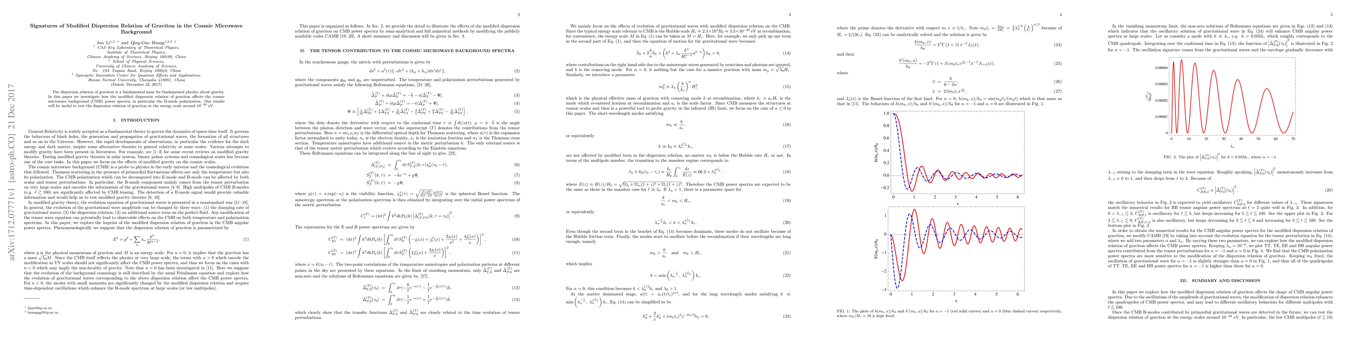 This paper explores the impact of a modified dispersion relation for gravitons on the cosmic microwave background (CMB) power spectra, particularly focusing on B-mode polarization. The findings provide insights for testing graviton dispersion at the energy scale of $10^{-29}$ eV.