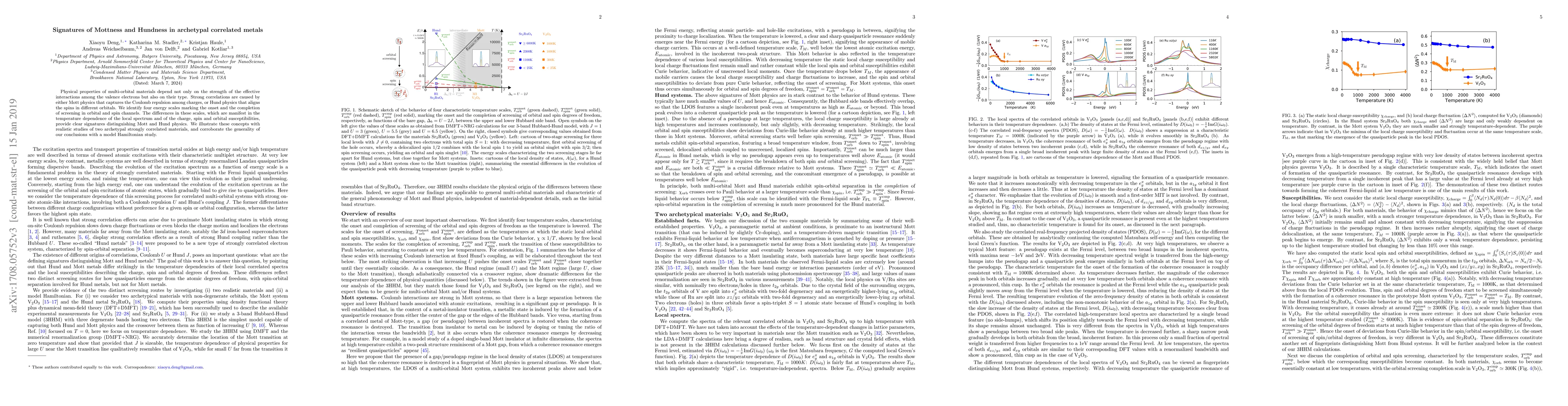 Physical properties of multi-orbital materials depend not only on the strength of the effective interactions among the valence electrons but also on their type. Strong correlations are caused by either Mott physics that captures the Coulomb repulsion among charges, or Hund physics that aligns the spins in different orbitals. We identify four energy scales marking the onset and the completion of screening in orbital and spin channels. The differences in these scales, which are manifest in the temperature dependence of the local spectrum and of the charge, spin and orbital susceptibilities, provide clear signatures distinguishing Mott and Hund physics. We illustrate these concepts with realistic studies of two archetypal strongly correlated materials, and corroborate the generality of our conclusions with a model Hamiltonian study.