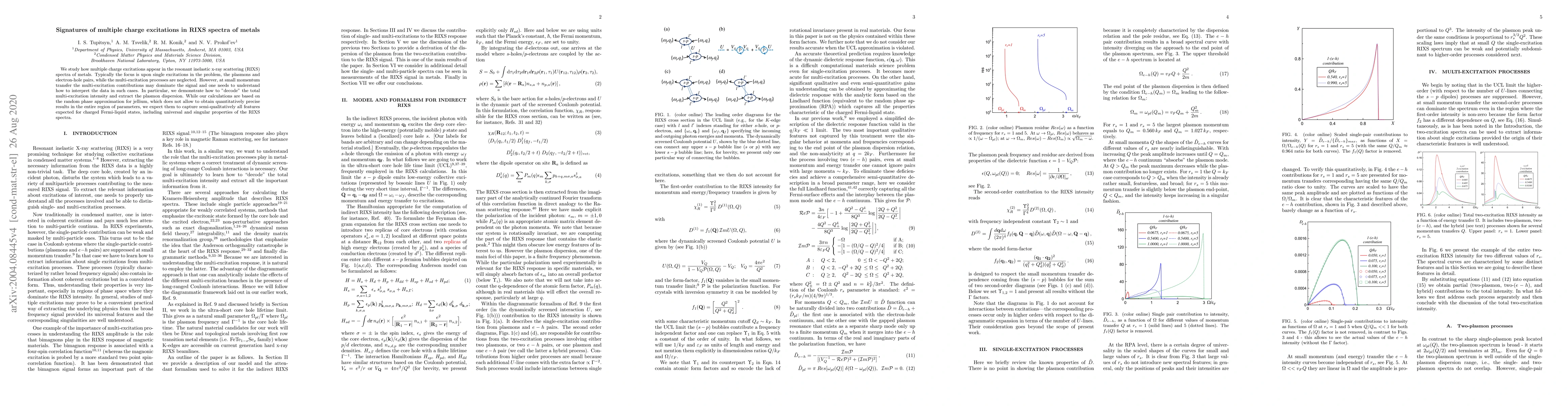 We study how multiple charge excitations appear in the resonant inelastic x-ray scattering (RIXS) spectra of metals. The single excitations in the problem are the plasmons and electron-hole pairs, and multi-excitation processes are usually neglected. However, at small momentum transfer the multi-excitation contributions may dominate the signal and one needs to understand how to interpret the data. In particular, we demonstrate how to "decode" the total multi-excitation intensity and extract the plasmon dispersion. While our calculations are based on the random phase approximation, which does not allow to obtain quantitatively precise results in the entire region of parameters, we expect them to capture semi-qualitatively all features expected for charged Fermi-liquid states, including universal and singular properties of the RIXS spectra.