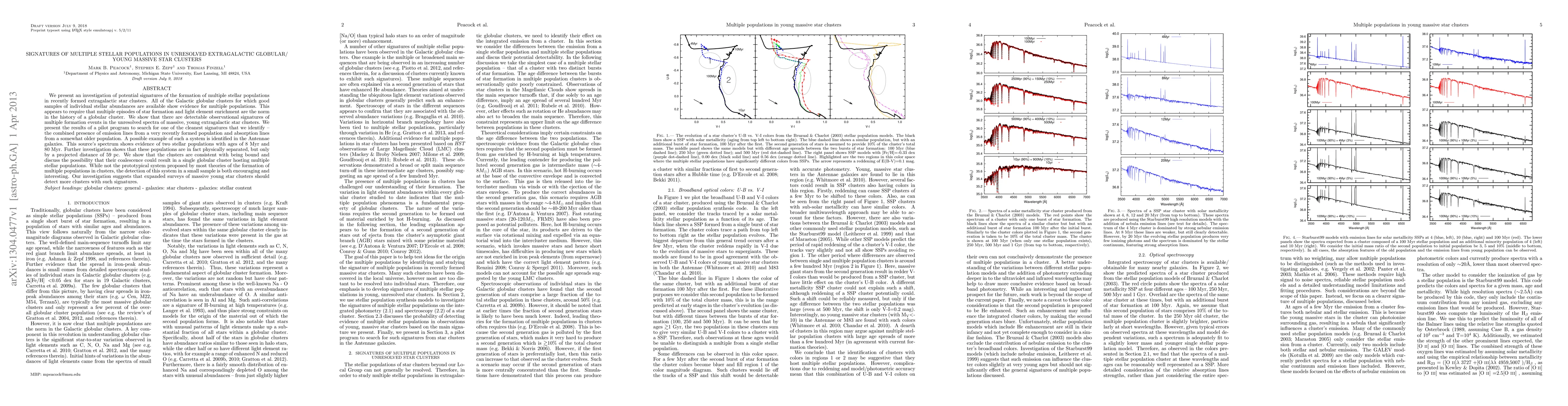 This paper investigates the presence of multiple stellar populations in extragalactic globular and young massive star clusters, finding evidence of distinct age groups within unresolved spectra. A notable example in the Antennae galaxies shows two stellar populations with ages of 8 Myr and 80 Myr, suggesting that such clusters may coalesce to form a single globular cluster with multiple populations.