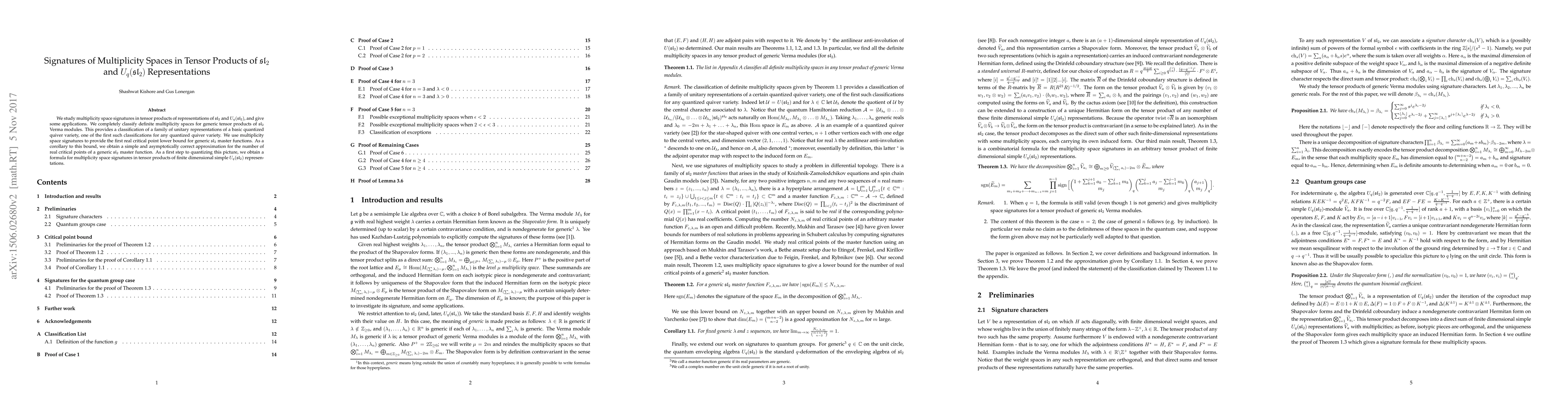 We study multiplicity space signatures in tensor products of representations of $\mathfrak{sl}_2$ and $U_q(\mathfrak{sl}_2)$, and give some applications. We completely classify definite multiplicity spaces for generic tensor products of $\mathfrak{sl}_2$ Verma modules. This provides a classification of a family of unitary representations of a basic quantized quiver variety, one of the first such classifications for any quantized quiver variety. We use multiplicity space signatures to provide the first real critical point lower bound for generic $\mathfrak{sl}_2$ master functions. As a corollary of this bound, we obtain a simple and asymptotically correct approximation for the number of real critical points of a generic $\mathfrak{sl}_2$ master function. We obtain a formula for multiplicity space signatures in tensor products of finite dimensional simple $U_q(\mathfrak{sl}_2)$ representations. Our formula also gives multiplicity space signatures in generic tensor products of $\mathfrak{sl}_2$ Verma modules and generic tensor products of real $U_q(\mathfrak{sl}_2)$ Verma modules. Our results have relations with knot theory, statistical mechanics, quantum physics, and geometric representation theory.