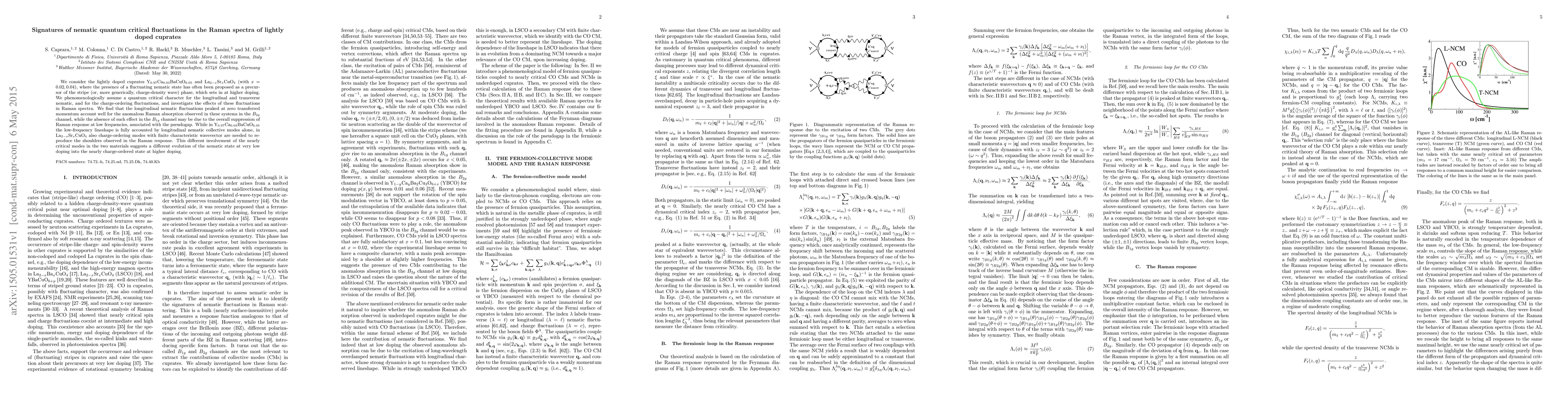 This study investigates the Raman spectra of lightly doped cuprates, revealing that longitudinal nematic fluctuations significantly contribute to the anomalous Raman absorption in the $B_{2g}$ channel, while the $B_{1g}$ channel is suppressed due to pseudogap effects. The differing roles of nematic and charge-ordering fluctuations in Y$_{0.97}$Ca$_{0.03}$BaCuO$_{6.05}$ and La$_{2-x}$Sr$_x$CuO$_4$ suggest distinct pathways for the nematic state's evolution with doping.