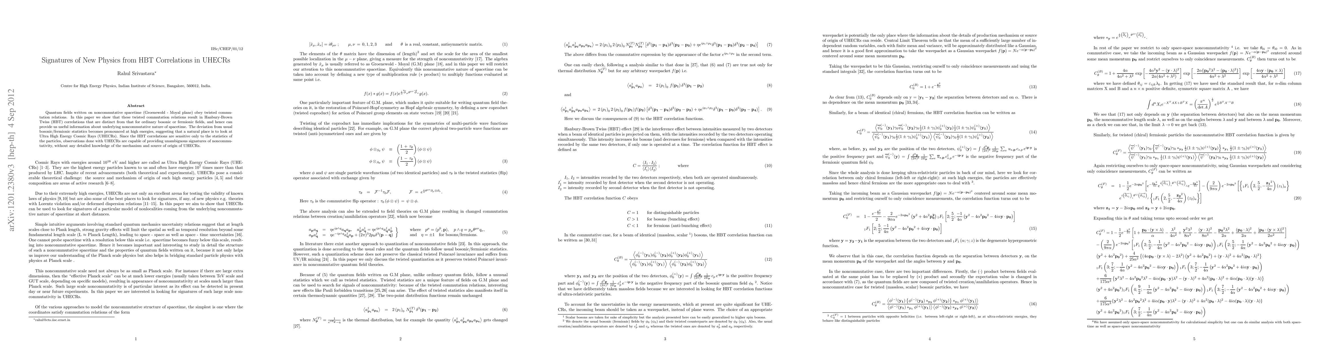 Quantum fields written on noncommutative spacetime (Groenewold - Moyal plane) obey twisted commutation relations. In this paper we show that these twisted commutation relations result in Hanbury-Brown Twiss (HBT) correlations that are distinct from that for ordinary bosonic or fermionic fields, and hence can provide us useful information about underlying noncommutative nature of spacetime. The deviation from usual bosonic/fermionic statistics becomes pronounced at high energies, suggesting that a natural place is to look at Ultra High Energy Cosmic Rays (UHECRs). Since the HBT correlations are sensitive only to the statistics of the particles, observations done with UHECRs are capable of providing unambiguous signatures of noncommutativity, without any detailed knowledge of the mechanism and source of origin of UHECRs.
