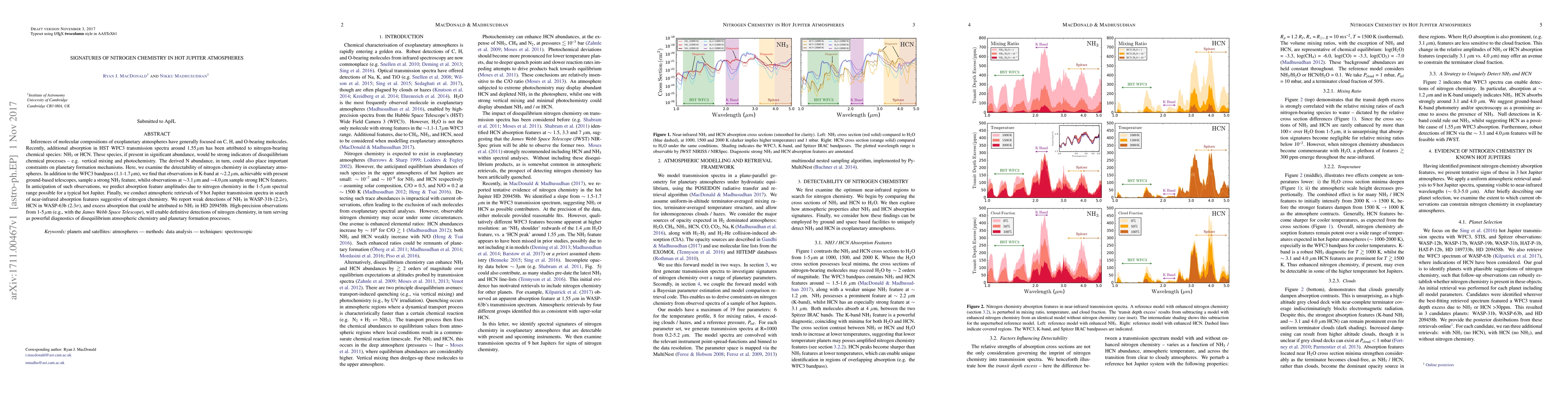 This paper investigates the signatures of nitrogen chemistry in hot Jupiter atmospheres, identifying potential absorption features in the near-infrared spectrum indicative of NH$_3$ and HCN. The study predicts that high-precision observations in the 1-5$\mu$m range, such as those from the James Webb Space Telescope, will enable definitive detections, providing insights into atmospheric disequilibrium and planetary formation mechanisms.